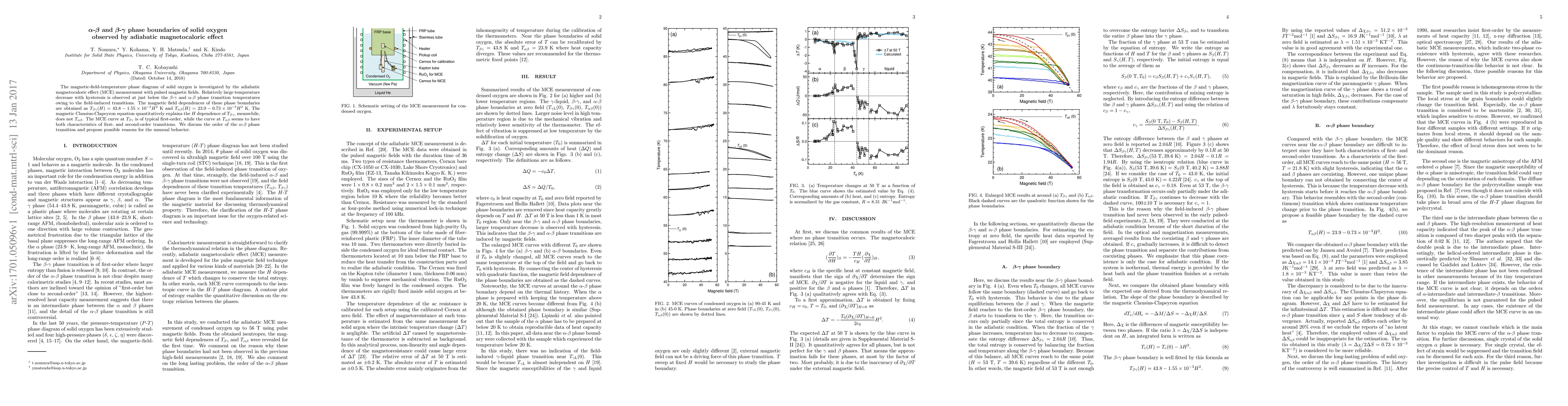 The magnetic-field-temperature phase diagram of solid oxygen is investigated by the adiabatic magnetocaloric effect (MCE) measurement with pulsed magnetic fields. Relatively large temperature decrease with hysteresis is observed at just below the $\beta$-$\gamma$ and $\alpha$-$\beta$ phase transition temperatures owing to the field-induced transitions. The magnetic field dependences of these phase boundaries are obtained as $T_\mathrm{\beta\gamma}(H)=43.8-1.55\times10^{-3}H^2$ K and $T_\mathrm{\alpha\beta}(H)=23.9-0.73\times10^{-3}H^2$ K. The magnetic Clausius-Clapeyron equation quantitatively explains the $H$ dependence of $T_\mathrm{\beta\gamma}$, meanwhile, does not $T_\mathrm{\alpha\beta}$. The MCE curve at $T_\mathrm{\beta\gamma}$ is of typical first-order, while the curve at $T_\mathrm{\alpha\beta}$ seems to have both characteristics of first- and second-order transitions. We discuss the order of the $\alpha$-$\beta$ phase transition and propose possible reasons for the unusual behavior.