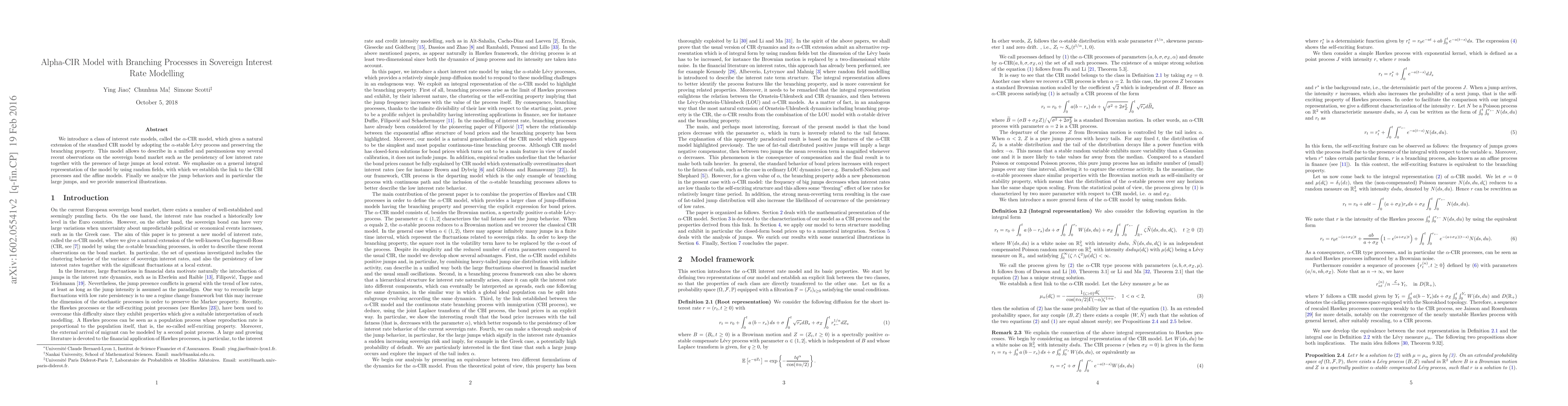 We introduce a class of interest rate models, called the $\alpha$-CIR model, which gives a natural extension of the standard CIR model by adopting the $\alpha$-stable L{\'e}vy process and preserving the branching property. This model allows to describe in a unified and parsimonious way several recent observations on the sovereign bond market such as the persistency of low interest rate together with the presence of large jumps at local extent. We emphasize on a general integral representation of the model by using random fields, with which we establish the link to the CBI processes and the affine models. Finally we analyze the jump behaviors and in particular the large jumps, and we provide numerical illustrations.