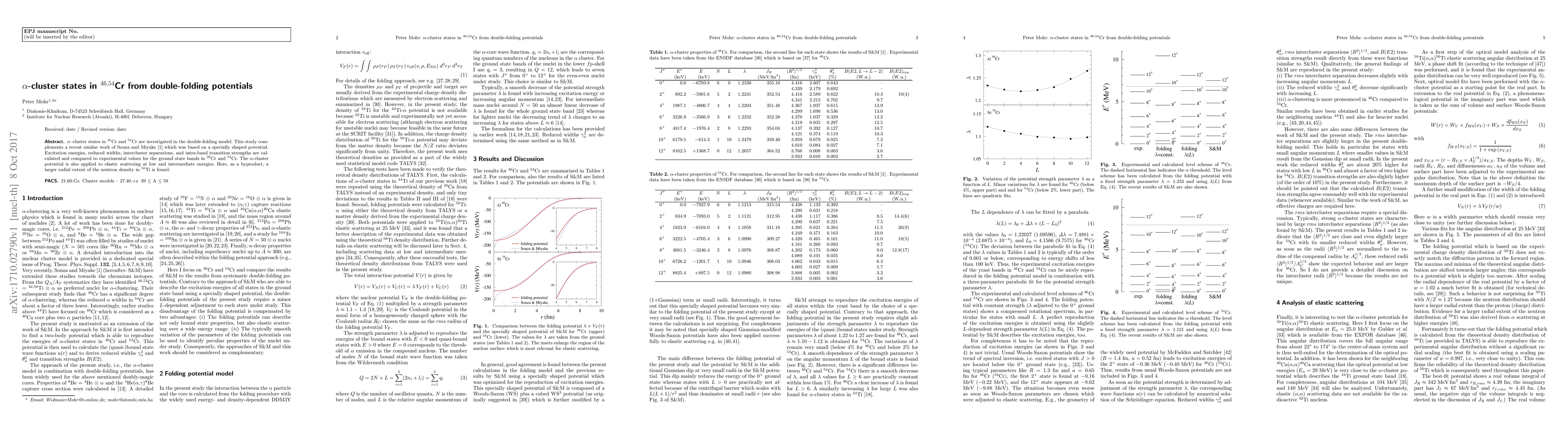 $\alpha$--cluster states in $^{46}$Cr and $^{54}$Cr are investigated in the double-folding model. This study complements a recent similar work of Souza and Miyake \cite{Sou17} which was based on a specially shaped potential. Excitation energies, reduced widths, intercluster separations, and intra-band transition strengths are calculated and compared to experimental values for the ground state bands in $^{46}$Cr and $^{54}$Cr. The $\alpha$-cluster potential is also applied to elastic scattering at low and intermediate energies. Here, as a byproduct, a larger radial extent of the neutron density in $^{50}$Ti is found.