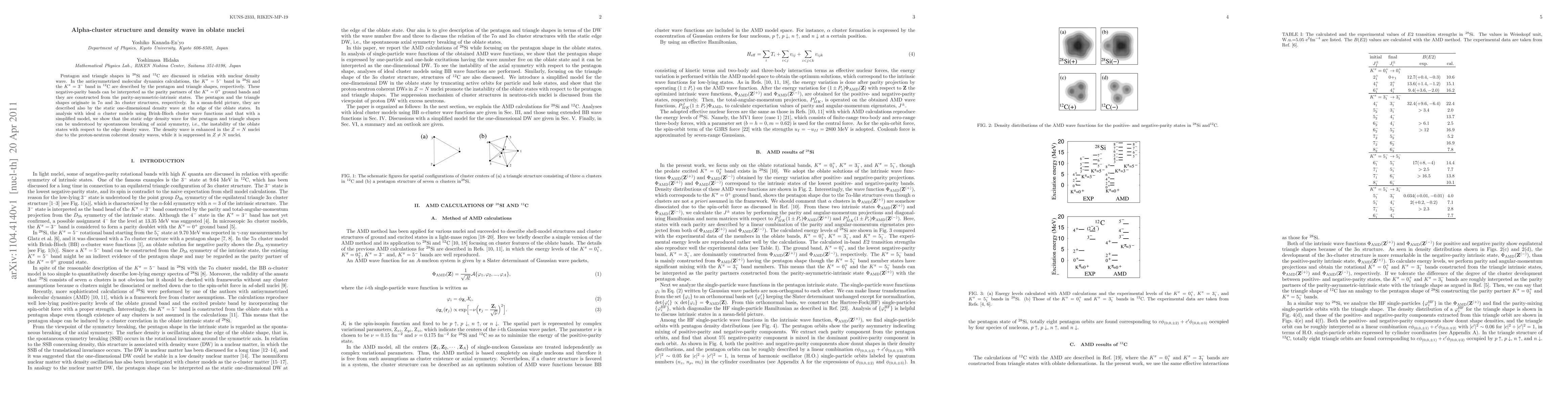 This paper investigates the alpha-cluster structures and density waves in oblate nuclei, specifically Si-28 and C-12, revealing pentagon and triangle shapes linked to nuclear density waves. The study shows that these shapes arise from 7alpha and 3alpha cluster structures, respectively, and are associated with spontaneous breaking of axial symmetry.