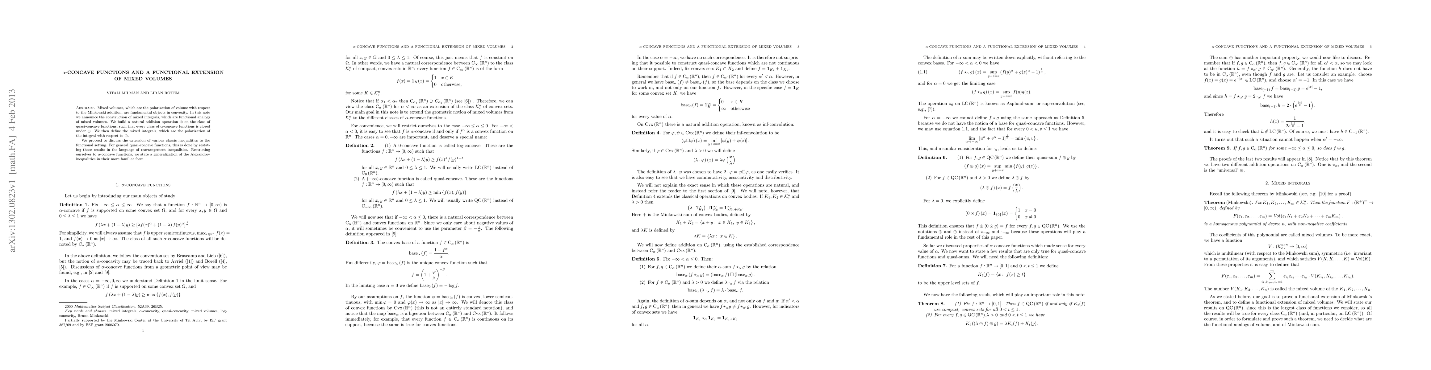 Mixed volumes, which are the polarization of volume with respect to the Minkowski addition, are fundamental objects in convexity. In this note we announce the construction of mixed integrals, which are functional analogs of mixed volumes. We build a natural addition operation + on the class of quasi-concave functions, such that every class of \alpha-concave functions is closed under +. We then define the mixed integrals, which are the polarization of the integral with respect to +. We proceed to discuss the extension of various classic inequalities to the functional setting. For general quasi-concave functions, this is done by restating those results in the language of rearrangement inequalities. Restricting ourselves to \alpha-concave functions, we state a generalization of the Alexandrov inequalities in their more familiar form.
