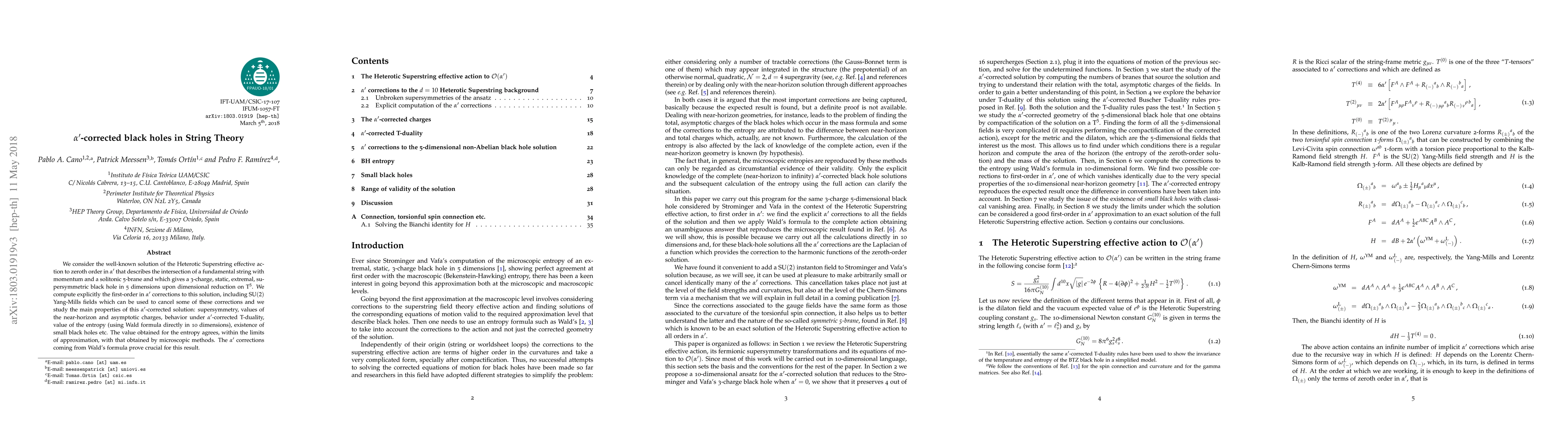This paper investigates $\alpha'$-corrected solutions of heterotic string theory, focusing on a 5-dimensional black hole derived from an intersection of strings and 5-branes. It computes first-order $\alpha'$ corrections and their implications for supersymmetry, entropy, and T-duality, confirming agreement between corrected entropy and microscopic calculations.