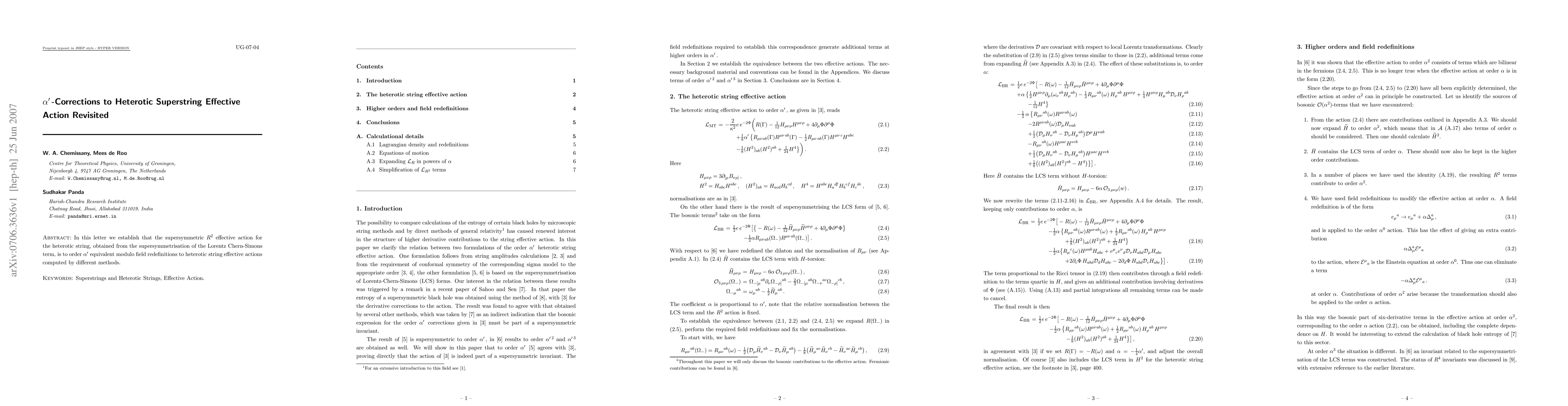 In this letter we establish that the supersymmetric R^2 effective action for the heterotic string, obtained from the supersymmetrisation of the Lorentz Chern-Simons term, is to order $\alpha'$ equivalent modulo field redefinitions to heterotic string effective actions computed by different methods.