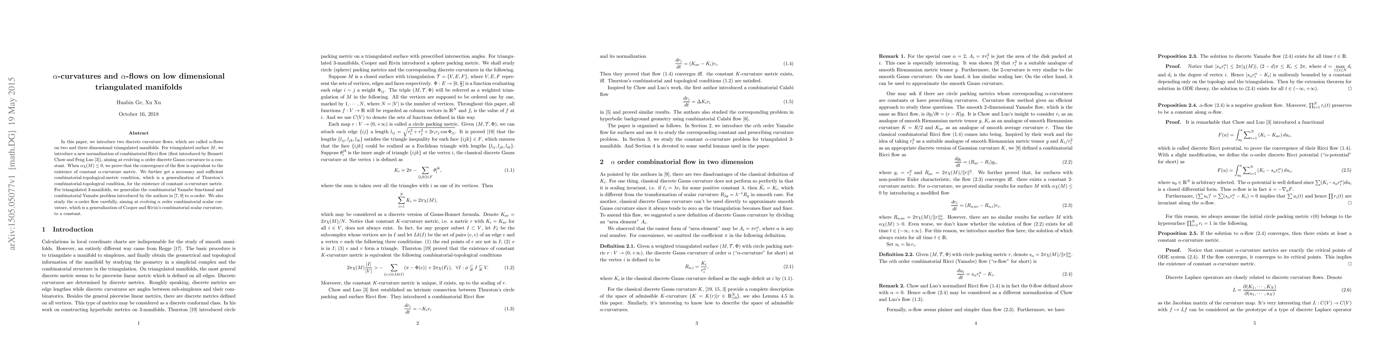 In this paper, we introduce two discrete curvature flows, which are called $\alpha$-flows on two and three dimensional triangulated manifolds. For triangulated surface $M$, we introduce a new normalization of combinatorial Ricci flow (first introduced by Bennett Chow and Feng Luo \cite{CL1}), aiming at evolving $\alpha$ order discrete Gauss curvature to a constant. When $\alpha\chi(M)\leq0$, we prove that the convergence of the flow is equivalent to the existence of constant $\alpha$-curvature metric. We further get a necessary and sufficient combinatorial-topological-metric condition, which is a generalization of Thurston's combinatorial-topological condition, for the existence of constant $\alpha$-curvature metric. For triangulated 3-manifolds, we generalize the combinatorial Yamabe functional and combinatorial Yamabe problem introduced by the authors in \cite{GX2,GX4} to $\alpha$-order. We also study the $\alpha$-order flow carefully, aiming at evolving $\alpha$ order combinatorial scalar curvature, which is a generalization of Cooper and Rivin's combinatorial scalar curvature, to a constant.