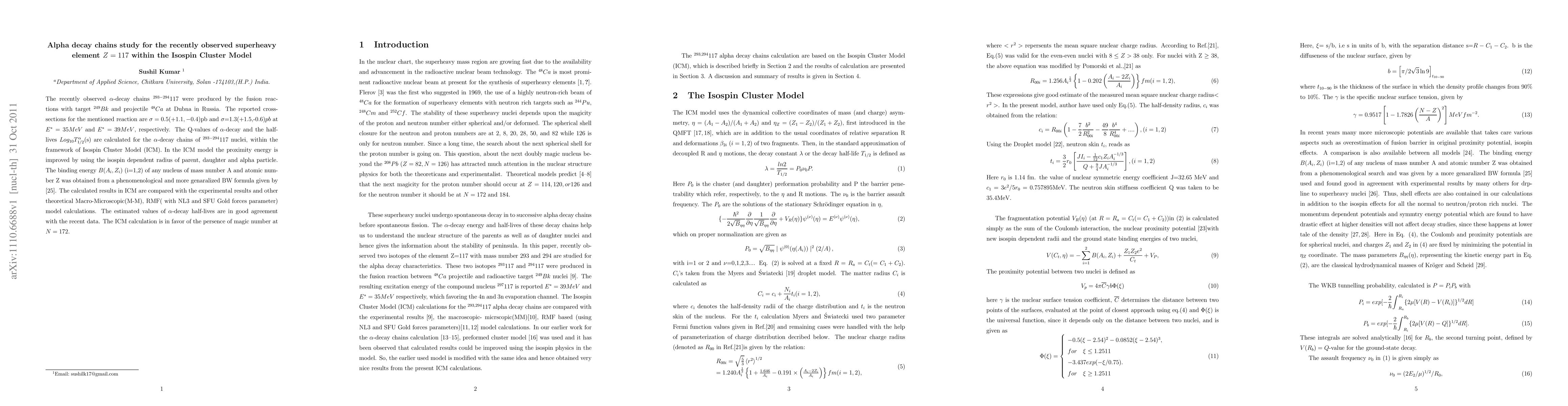 Researchers studied the alpha decay chains of a newly discovered superheavy element (Z=117) using the Isospin Cluster Model, finding good agreement with experimental data and suggesting its magic number at N=172.