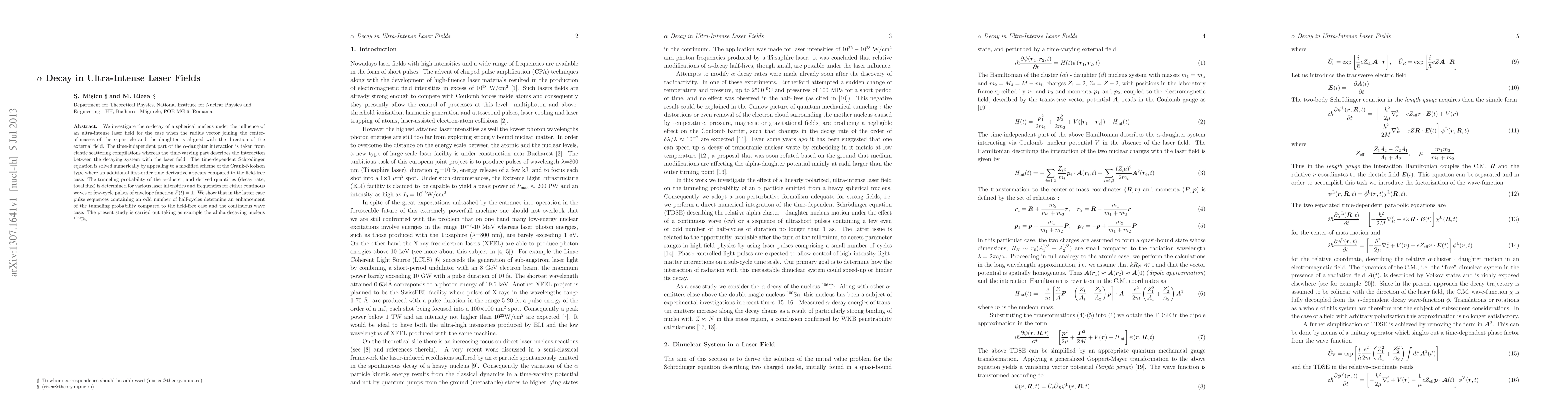 This paper investigates the alpha decay of a spherical nucleus under ultra-intense laser fields, showing that odd-numbered half-cycle pulse sequences enhance the tunneling probability compared to continuous waves. The study uses a modified Crank-Nicolson scheme to solve the time-dependent Schrödinger equation for the example of $^{106}$Te.