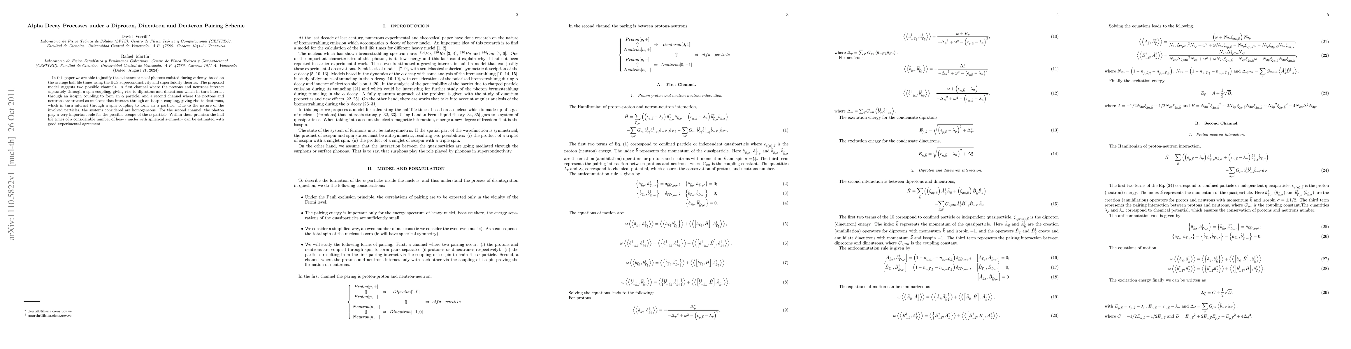 In this paper we are able to justify the existence or no of photons emitted during $\alpha$ decay, based on the average half life times using the BCS superconductivity and superfluidity theories. The proposed model suggests two possible channels. A first channel where the protons and neutrons interact separately through a spin coupling, giving rise to diprotons and dineutrons which in turn interact through an isospin coupling to form an $\alpha$ particle, and a second channel where the protons and neutrons are treated as nucleons that interact through an isospin coupling, giving rise to deuterons, which in turn interact through a spin coupling to form an $\alpha$ particle. Due to the nature of the involved particles, the systems considered are homogeneous. For the second channel, the photon play a very important role for the possible escape of the $\alpha$ particle. Within these premises the half life times of a considerable number of heavy nuclei with spherical symmetry can be estimated with good experimental agreement.