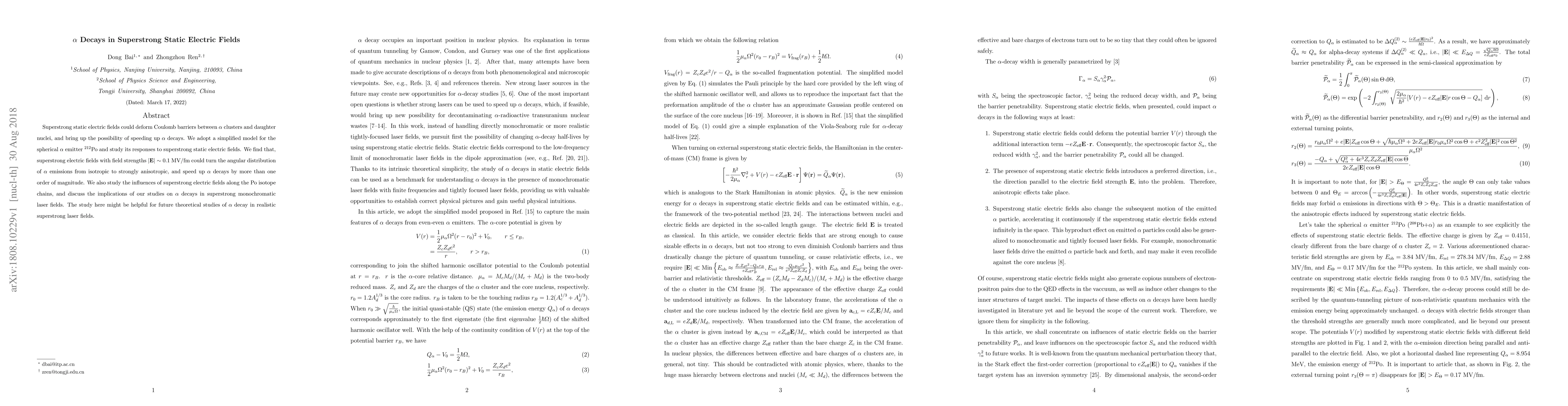 Superstrong static electric fields could deform Coulomb barriers between $\alpha$ clusters and daughter nuclei, and bring up the possibility of speeding up $\alpha$ decays. We adopt a simplified model for the spherical $\alpha$ emitter $^{212}$Po and study its responses to superstrong static electric fields. We find that, superstrong electric fields with field strengths $|\mathbf{E}|\sim0.1$ MV/fm could turn the angular distribution of $\alpha$ emissions from isotropic to strongly anisotropic, and speed up $\alpha$ decays by more than one order of magnitude. We also study the influences of superstrong electric fields along the Po isotope chains, and discuss the implications of our studies on $\alpha$ decays in superstrong monochromatic laser fields. The study here might be helpful for future theoretical studies of $\alpha$ decay in realistic superstrong laser fields.