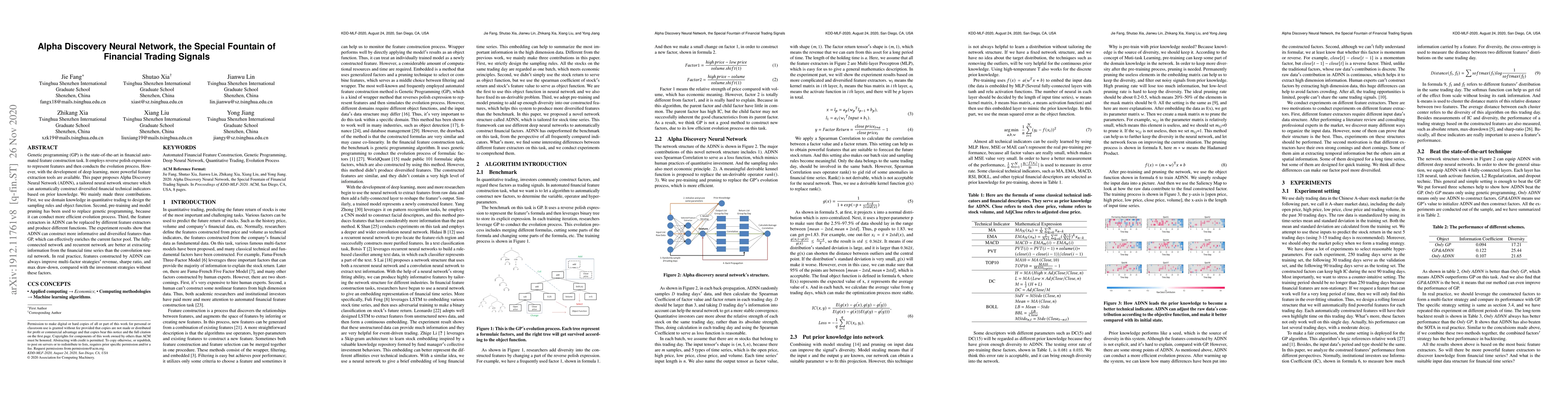 This paper proposes the Alpha Discovery Neural Network (ADNN) to enhance automated feature construction in financial trading, leveraging domain knowledge and pre-training to outperform genetic programming. ADNN's adaptable feature extractors generate diverse, informative features that improve multi-factor trading strategies' performance.