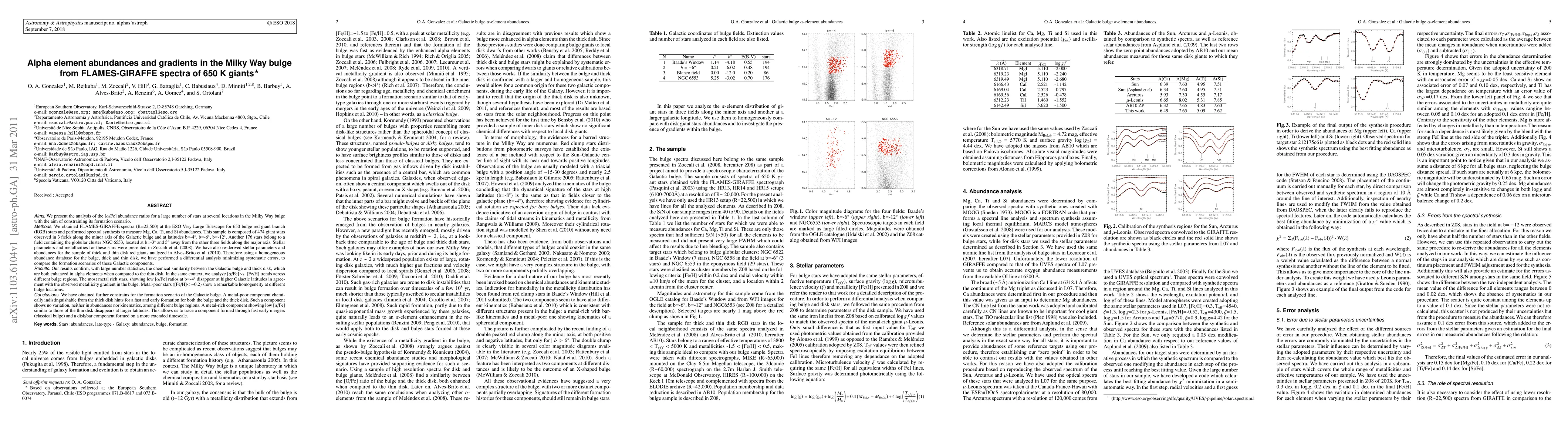 This study uses FLAMES-GIRAFFE spectra to analyze the alpha element abundances of 650 red giant branch stars in the Milky Way bulge, confirming the chemical similarity between the bulge and thick disk. The research reveals distinct [alpha/Fe] vs. [Fe/H] trends, supporting a fast early formation for a metal-poor component shared with the thick disk and a more extended formation for a metal-rich component.