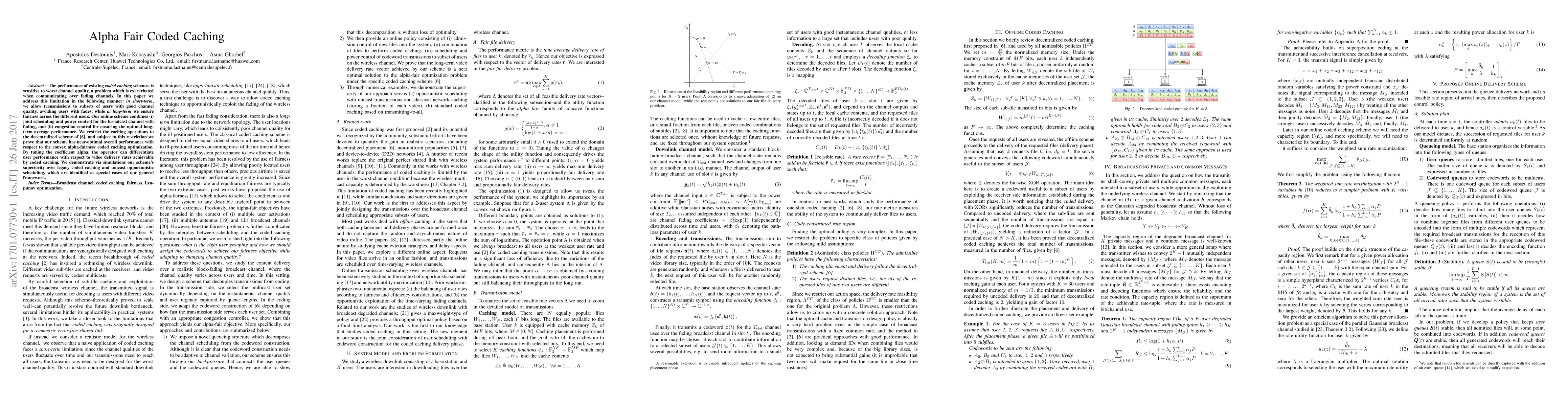The performance of existing \emph{coded caching} schemes is sensitive to worst channel quality, a problem which is exacerbated when communicating over fading channels. In this paper we address this limitation in the following manner: \emph{in short-term}, we allow transmissions to subsets of users with good channel quality, avoiding users with fades, while \emph{in long-term} we ensure fairness across the different users.Our online scheme combines (i) joint scheduling and power control for the broadcast channel with fading, and (ii) congestion control for ensuring the optimal long-term average performance. We restrict the caching operations to the decentralized scheme of \cite{maddah2013decentralized}, and subject to this restriction we prove that our scheme has near-optimal overall performance with respect to the convex alpha-fairness coded caching optimization. By tuning the coefficient alpha, the operator can differentiate user performance with respect to video delivery rates achievable by coded caching. We demonstrate via simulations our scheme's superiority over legacy coded caching and unicast opportunistic scheduling, which are identified as special cases of our general framework.