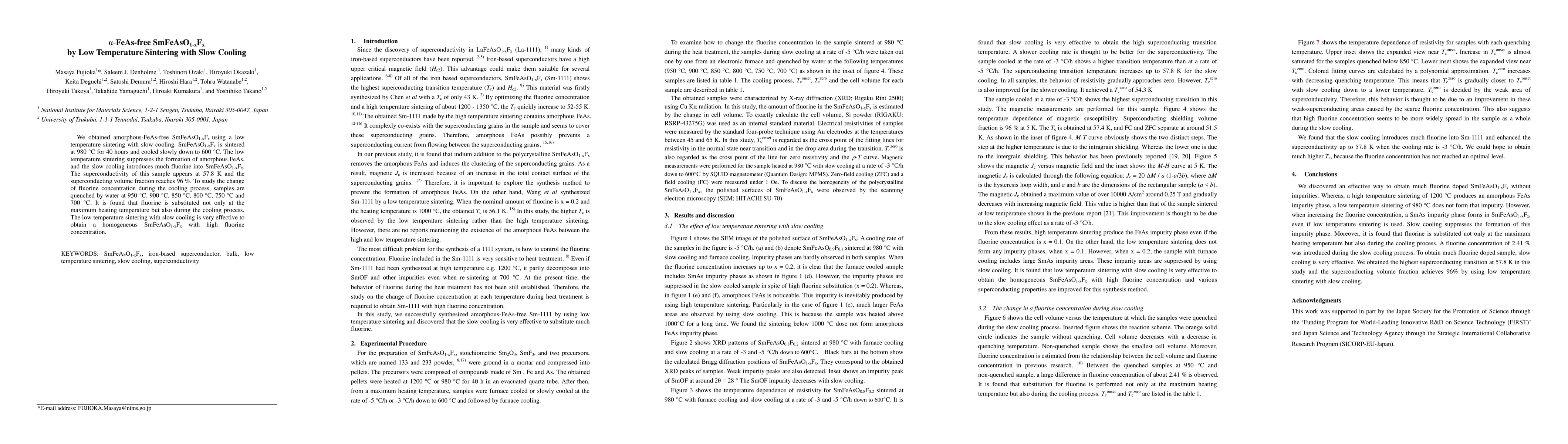 This paper reports the synthesis of amorphous-FeAs-free SmFeAsO1-xFx using low temperature sintering at 980 °C for 40 hours followed by slow cooling to 600 °C, which suppresses amorphous FeAs formation and enhances fluorine incorporation. The resulting material exhibits superconductivity at 57.8 K with a 96% superconducting volume fraction.
