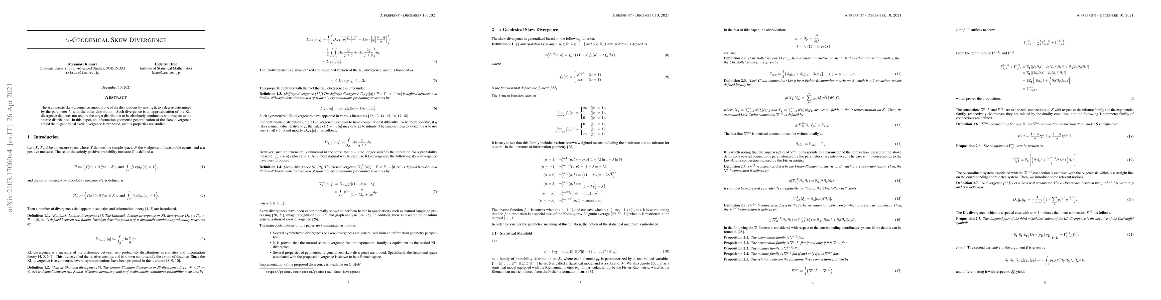 This paper proposes an $\alpha$-geodesical skew divergence, a generalization of the asymmetric skew divergence, which approximates the KL divergence without requiring the target distribution to be absolutely continuous with respect to the source distribution. The properties of this new divergence are explored.