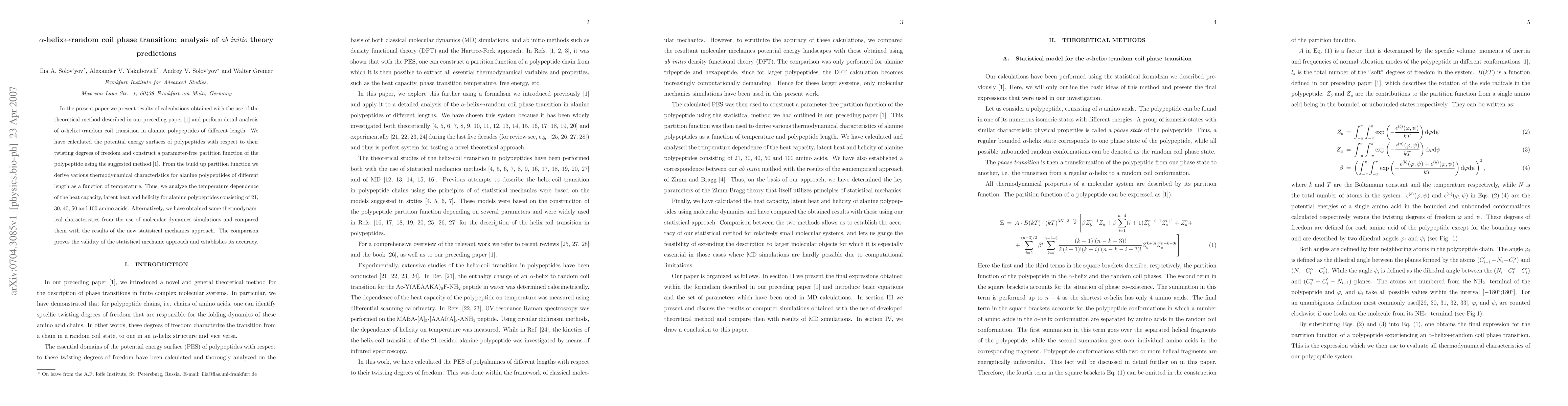 This paper analyzes the alpha helix-coil phase transition in alanine polypeptides using an ab initio theoretical method, comparing it with molecular dynamics simulations to validate the approach and derive thermodynamic properties like heat capacity and helicity.