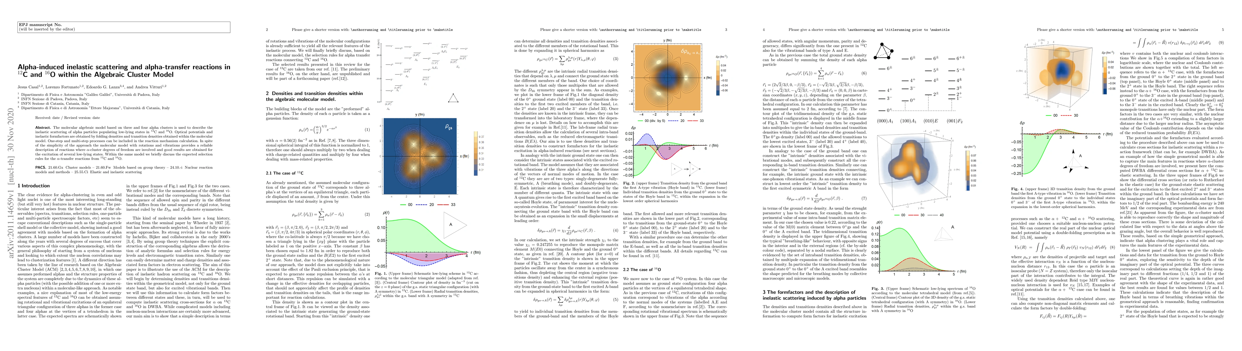 This paper uses the algebraic cluster model to describe alpha-induced inelastic scattering and alpha-transfer reactions in $^{12}$C and $^{16}$O, obtaining optical potentials and formfactors through molecular model calculations. The model provides a reliable description of reactions involving alpha clusters, yielding good results for low-lying state excitations and discussing selection rules for alpha-transfer processes.