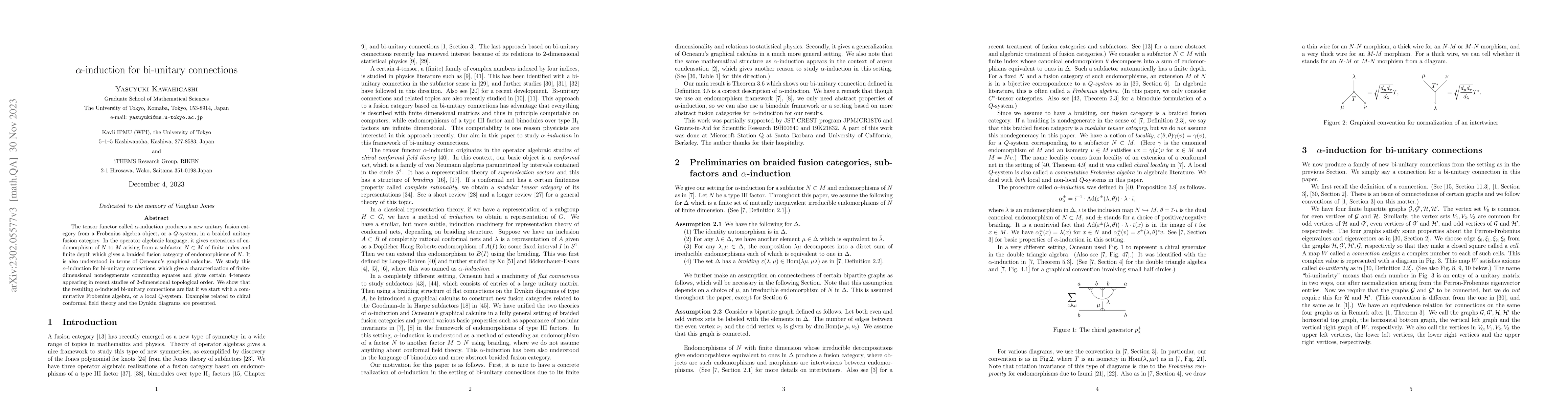 The tensor functor called $\alpha$-induction arises from a Frobenius algebra object, or a Q-system, in a braided unitary fusion category. In the operator algebraic language, it gives extensions of endomorphism of $N$ to $M$ arising from a subfactor $N\subset M$ of finite index and finite depth giving a braided fusion category of endomorpshisms of $N$. It is also understood in terms of Ocneanu's graphical calculus. We study this $\alpha$-induction for bi-unitary connections, which give a characterization of finite-dimensional nondegenerate commuting squares and gives certain 4-tensors appearing in recent studies of 2-dimensional topological order. We show that the resulting $\alpha$-induced bi-unitary connections are flat if we have a commutative Frobenius algebra, or a local Q-system. Examples related to chiral conformal field theory and the Dynkin diagrams are presented.