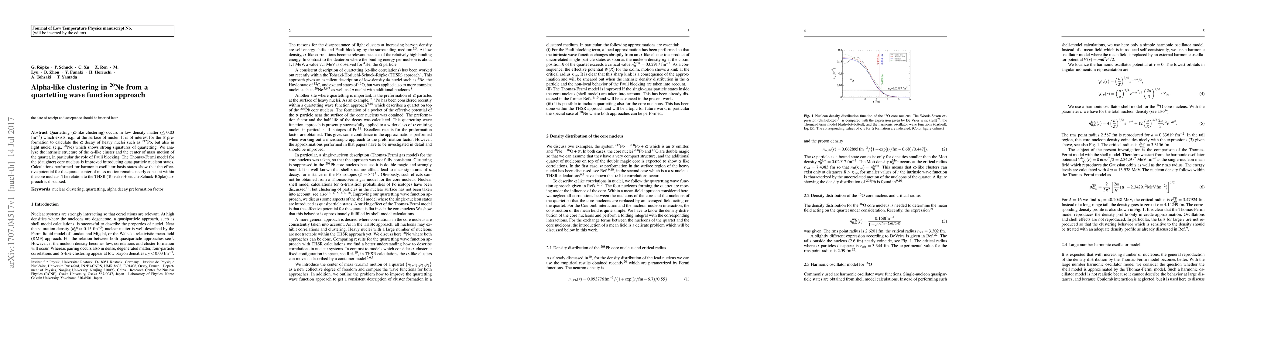 Quartetting ($\alpha$-like clustering) occurs in low density matter ($\le 0.03$ fm$^{-3}$) which exists, e.g., at the surface of nuclei. It is of interest for the $\alpha$ preformation to calculate the $\alpha$ decay of heavy nuclei such as $^{212}$Po, but also in light nuclei (e.g., $^{20}$Ne) which shows strong signatures of quartetting. We analyze the intrinsic structure of the $\alpha$-like cluster and the center of mass motion of the quartet, in particular the role of Pauli blocking. The Thomas-Fermi model for the (daughter) core nucleus is improved introducing quasiparticle nucleon states. Calculations performed for harmonic oscillator basis states show that the effective potential for the quartet center of mass motion remains nearly constant within the core nucleus. The relation to the THSR (Tohsaki-Horiuchi-Schuck-R\"opke) approach is discussed.
