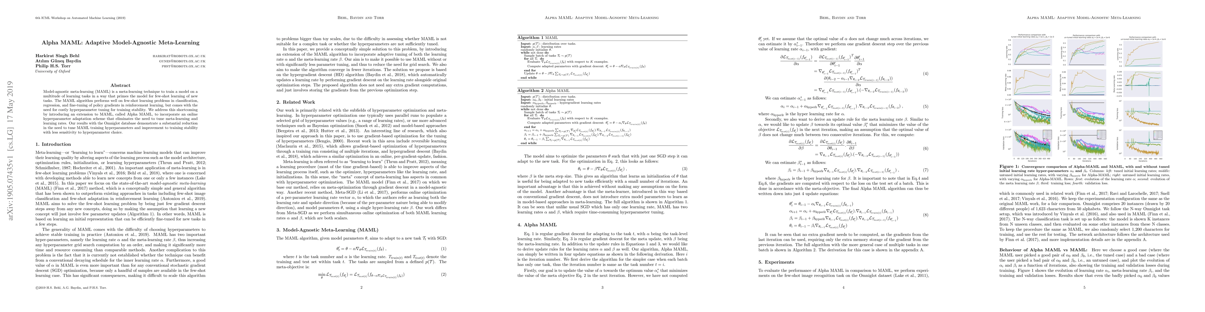 Model-agnostic meta-learning (MAML) is a meta-learning technique to train a model on a multitude of learning tasks in a way that primes the model for few-shot learning of new tasks. The MAML algorithm performs well on few-shot learning problems in classification, regression, and fine-tuning of policy gradients in reinforcement learning, but comes with the need for costly hyperparameter tuning for training stability. We address this shortcoming by introducing an extension to MAML, called Alpha MAML, to incorporate an online hyperparameter adaptation scheme that eliminates the need to tune meta-learning and learning rates. Our results with the Omniglot database demonstrate a substantial reduction in the need to tune MAML training hyperparameters and improvement to training stability with less sensitivity to hyperparameter choice.