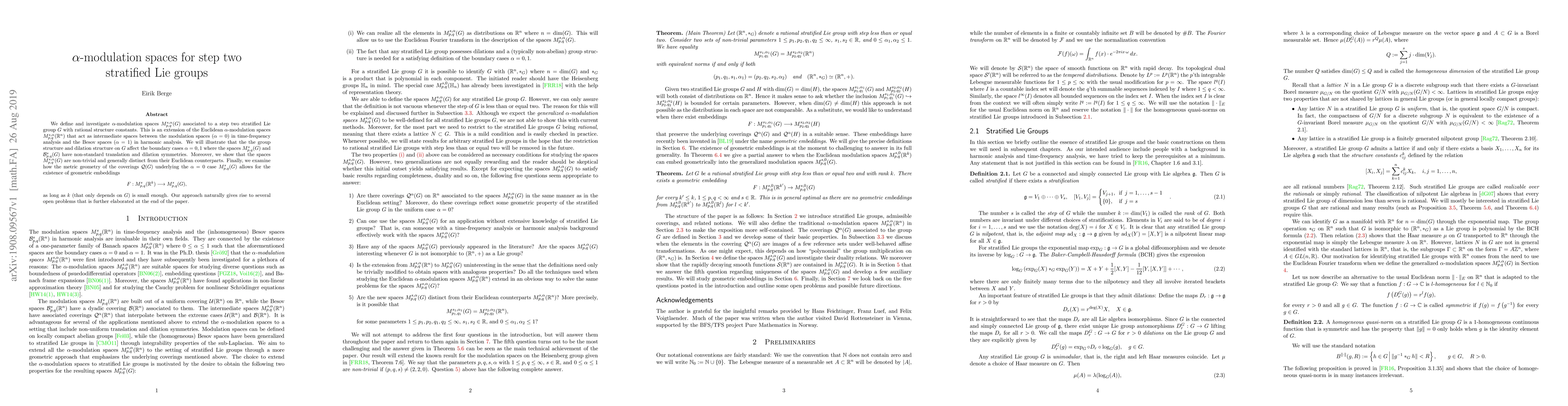 We define and investigate $\alpha$-modulation spaces $M_{p,q}^{s,\alpha}(G)$ associated to a step two stratified Lie group $G$ with rational structure constants. This is an extension of the Euclidean $\alpha$-modulation spaces $M_{p,q}^{s,\alpha}(\mathbb{R}^n)$ that act as intermediate spaces between the modulation spaces ($\alpha = 0$) in time-frequency analysis and the Besov spaces ($\alpha = 1$) in harmonic analysis. We will illustrate that the the group structure and dilation structure on $G$ affect the boundary cases $\alpha = 0,1$ where the spaces $M_{p,q}^{s}(G)$ and $\mathcal{B}_{p,q}^{s}(G)$ have non-standard translation and dilation symmetries. Moreover, we show that the spaces $M_{p,q}^{s,\alpha}(G)$ are non-trivial and generally distinct from their Euclidean counterparts. Finally, we examine how the metric geometry of the coverings $\mathcal{Q}(G)$ underlying the $\alpha = 0$ case $M_{p,q}^{s}(G)$ allows for the existence of geometric embeddings \[F:M_{p,q}^{s}(\mathbb{R}^k) \longrightarrow{} M_{p,q}^{s}(G),\] as long as $k$ (that only depends on $G$) is small enough. Our approach naturally gives rise to several open problems that is further elaborated at the end of the paper.