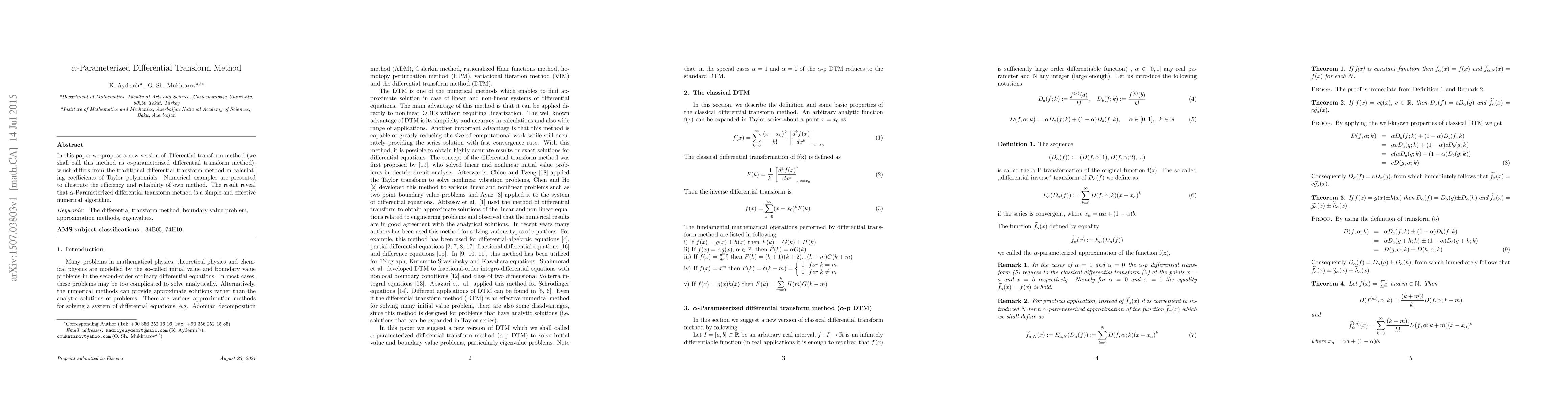 This paper introduces the u201cu03b1u201d-parameterized differential transform method, a modified version of the traditional differential transform method. The new method is shown to be efficient and reliable through numerical examples, demonstrating it as a simple and effective numerical algorithm.
