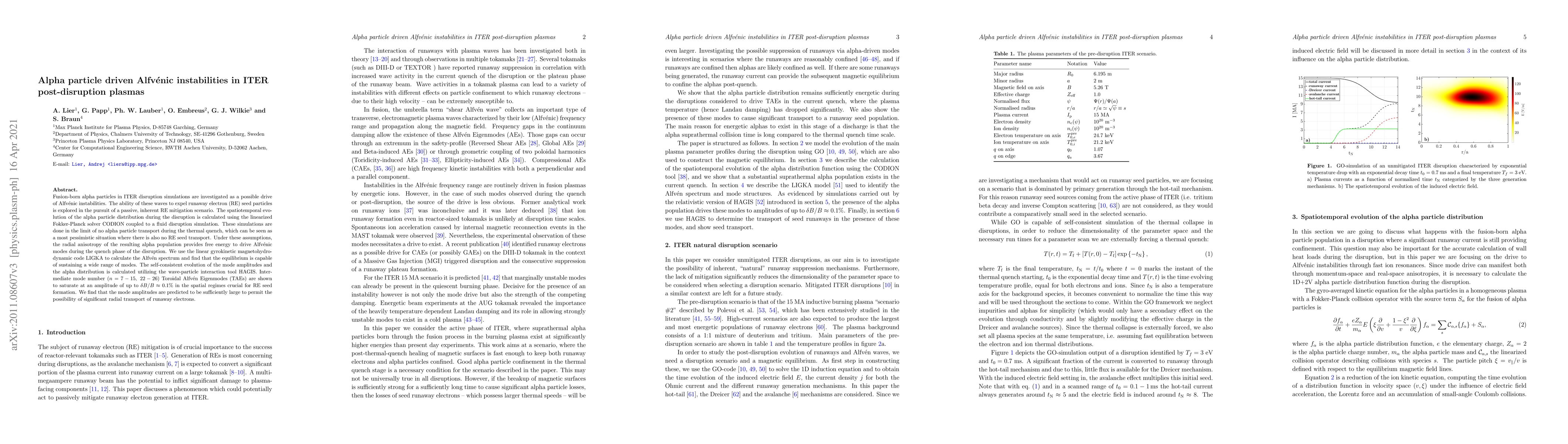 Fusion-born alpha particles in ITER disruption simulations are investigated as a possible drive of Alfv\'enic instabilities. The ability of these waves to expel runaway electron (RE) seed particles is explored in the pursuit of a passive, inherent RE mitigation scenario. The spatiotemporal evolution of the alpha particle distribution during the disruption is calculated using the linearized Fokker-Planck solver CODION coupled to a fluid disruption simulation. These simulations are done in the limit of no alpha particle transport during the thermal quench, which can be seen as a most pessimistic situation where there is also no RE seed transport. Under these assumptions, the radial anisotropy of the resulting alpha population provides free energy to drive Alfv\'enic modes during the quench phase of the disruption. We use the linear gyrokinetic magnetohydrodynamic code LIGKA to calculate the Alfv\'en spectrum and find that the equilibrium is capable of sustaining a wide range of modes. The self-consistent evolution of the mode amplitudes and the alpha distribution is calculated utilizing the wave-particle interaction tool HAGIS. Intermediate mode number ($n=7-15,~22-26$) Toroidal Alfv\'en Eigenmodes (TAEs) are shown to saturate at an amplitude of up to $\delta B /B \approx 0.1$\% in the spatial regimes crucial for RE seed formation. We find that the mode amplitudes are predicted to be sufficiently large to permit the possibility of significant radial transport of runaway electrons.