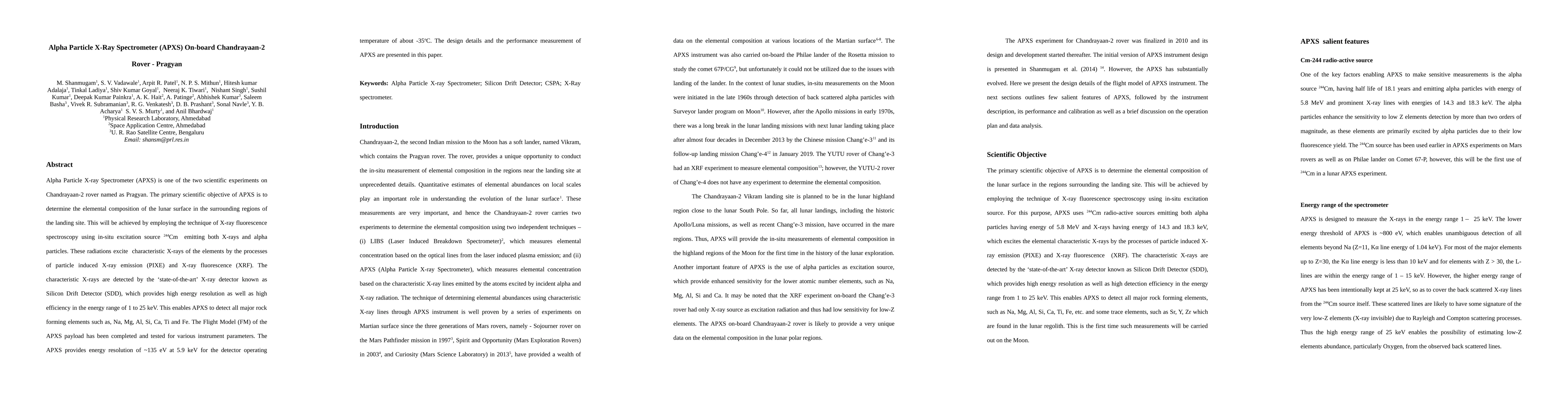 The Alpha Particle X-ray Spectrometer (APXS) on Chandrayaan-2's Pragyan rover aims to determine the elemental composition of the lunar surface using X-ray fluorescence spectroscopy. The APXS employs a Cm-244 source for excitation and a Silicon Drift Detector for high-resolution detection of characteristic X-rays, enabling the identification of major rock-forming elements.