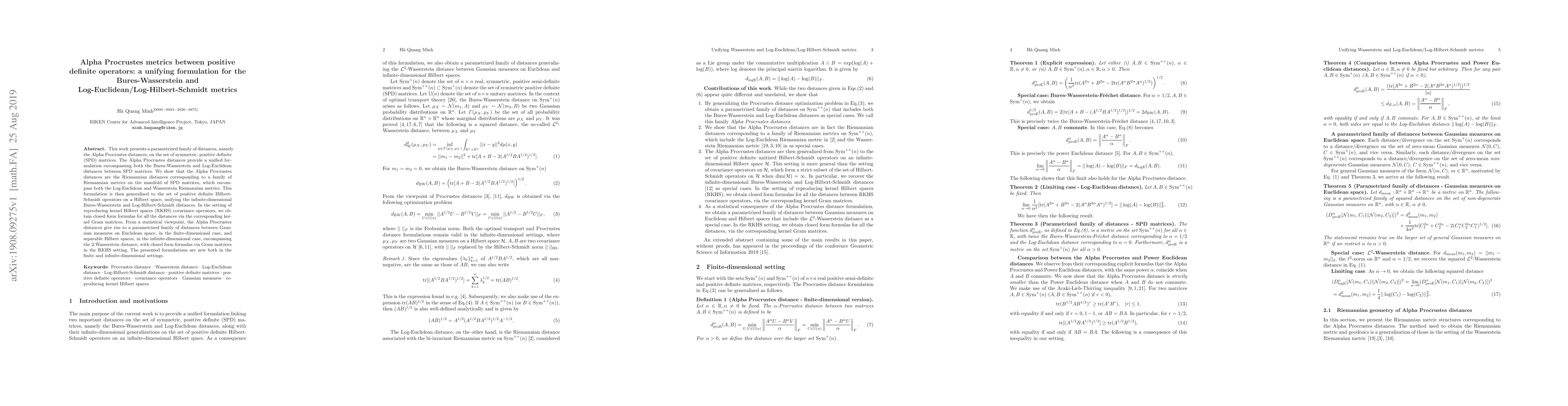This paper introduces the Alpha Procrustes distances, a unified metric framework for symmetric, positive definite matrices and positive definite Hilbert-Schmidt operators, encompassing both the Bures-Wasserstein and Log-Euclidean/Log-Hilbert-Schmidt distances. The formulations yield closed-form expressions via kernel Gram matrices in reproducing kernel Hilbert spaces.