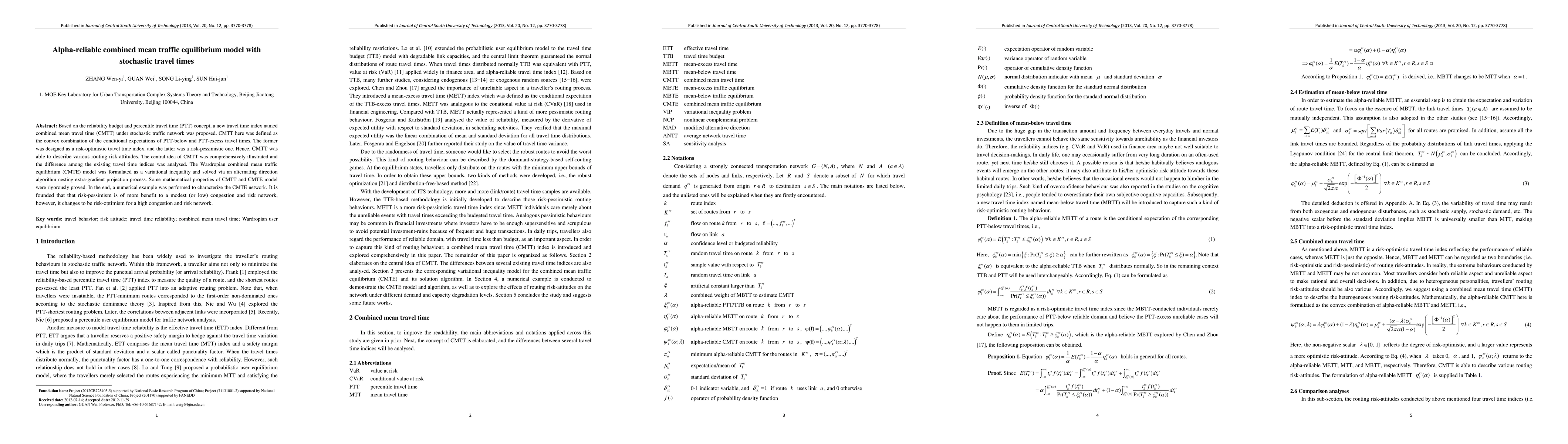 Based on the reliability budget and percentile travel time (PTT) concept, a new travel time index named combined mean travel time (CMTT) under stochastic traffic network was proposed. CMTT here was defined as the convex combination of the conditional expectations of PTT-below and PTT-excess travel times. The former was designed as a risk-optimistic travel time index, and the latter was a risk-pessimistic one. Hence, CMTT was able to describe various routing risk-attitudes. The central idea of CMTT was comprehensively illustrated and the difference among the existing travel time indices was analysed. The Wardropian combined mean traffic equilibrium (CMTE) model was formulated as a variational inequality and solved via an alternating direction algorithm nesting extra-gradient projection process. Some mathematical properties of CMTT and CMTE model were rigorously proved. In the end, a numerical example was performed to characterize the CMTE network. It is founded that that risk-pessimism is of more benefit to a modest (or low) congestion and risk network, however, it changes to be risk-optimism for a high congestion and risk network.