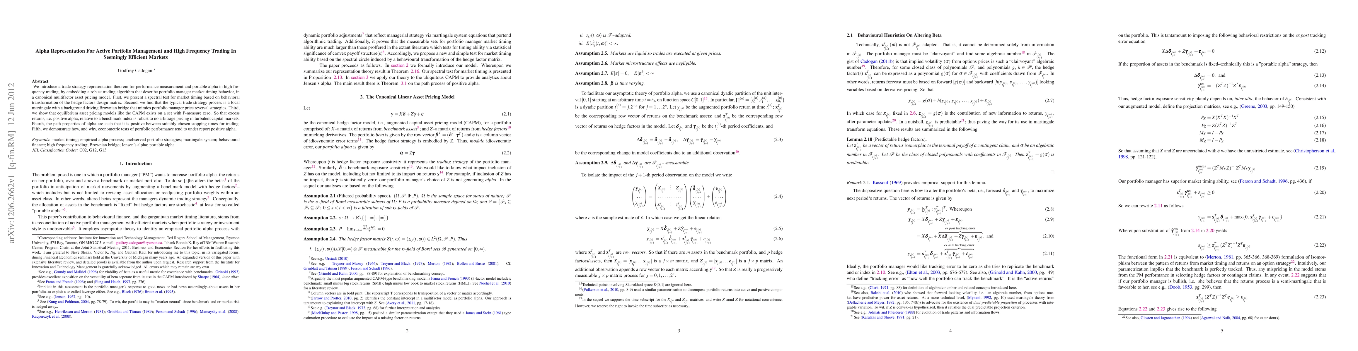 We introduce a trade strategy representation theorem for performance measurement and portable alpha in high frequency trading, by embedding a robust trading algorithm that describe portfolio manager market timing behavior, in a canonical multifactor asset pricing model. First, we present a spectral test for market timing based on behavioral transformation of the hedge factors design matrix. Second, we find that the typical trade strategy process is a local martingale with a background driving Brownian bridge that mimics portfolio manager price reversal strategies. Third, we show that equilibrium asset pricing models like the CAPM exists on a set with P-measure zero. So that excess returns, i.e. positive alpha, relative to a benchmark index is robust to no arbitrage pricing in turbulent capital markets. Fourth, the path properties of alpha are such that it is positive between suitably chosen stopping times for trading. Fifth, we demonstrate how, and why, econometric tests of portfolio performance tend to under report positive alpha.