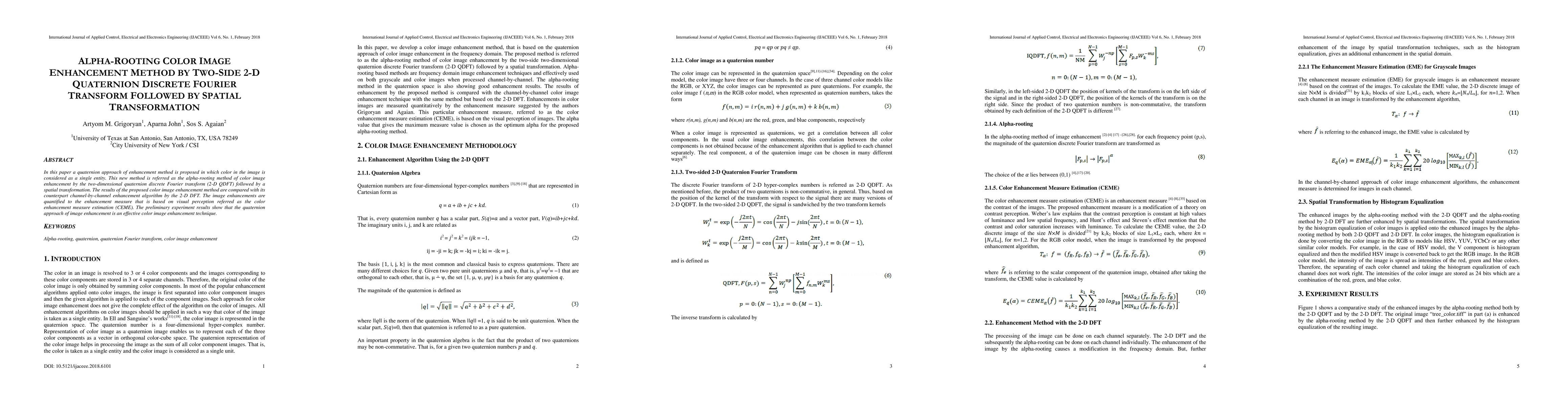 This paper proposes an alpha-rooting method for color image enhancement using a two-dimensional quaternion discrete Fourier transform, followed by spatial transformation, demonstrating superior results compared to the channel-by-channel method based on visual perception. Preliminary experiments indicate the effectiveness of the quaternion approach.