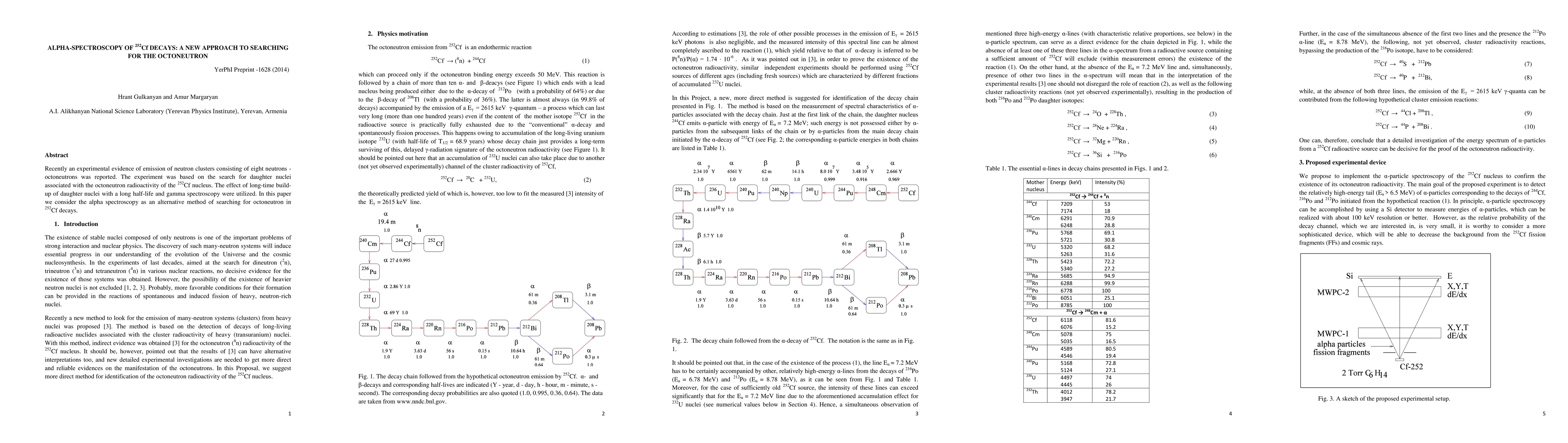 This paper explores the use of alpha spectroscopy to detect octoneutrons emitted during Cf-252 decays, offering an alternative method to previous long-time build-up and gamma spectroscopy approaches. The study aims to identify daughter nuclei associated with the octoneutron radioactivity.