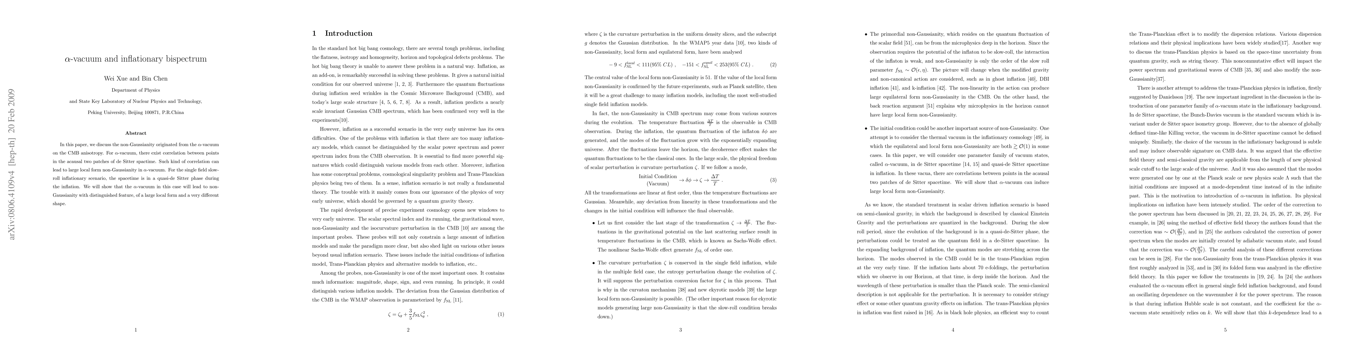 In this paper, we discuss the non-Guassianity originated from the $\alpha$-vacuum on the CMB anisotropy. For $\alpha$-vacuum, there exist correlation between points in the acausal two patches of de Sitter spactime. Such kind of correlation can lead to large local form non-Guassianity in $\alpha$-vacuum. For the single field slow-roll inflationary scenario, the spacetime is in a quasi-de Sitter phase during the inflation. We will show that the $\alpha$-vacuum in this case will lead to non-Gaussianity with distinguished feature, of a large local form and a very different shape.