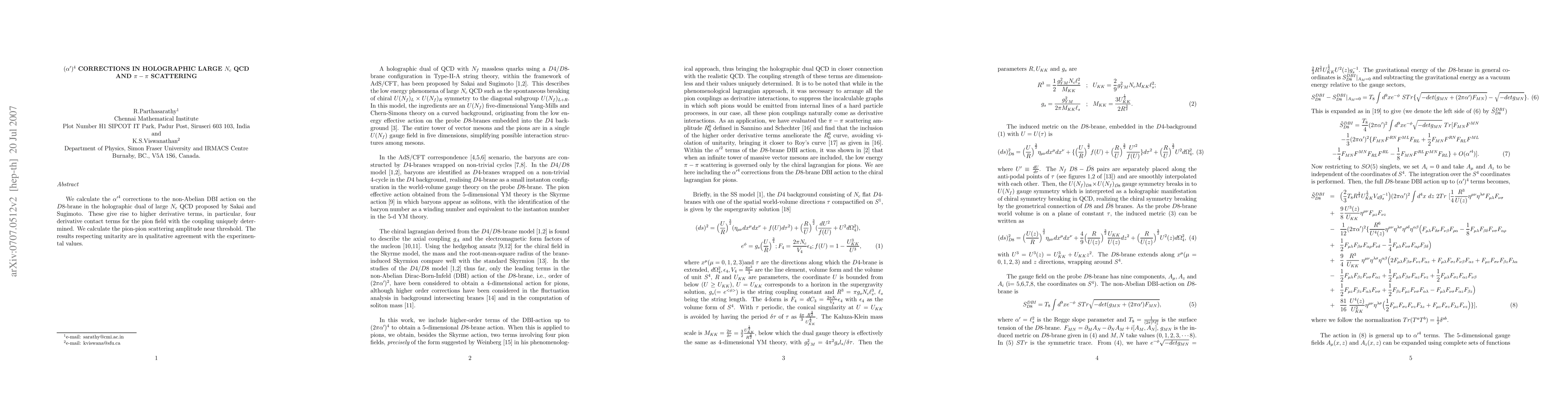 We calculate the ${\alpha'}^4$ corrections to the non-Abelian DBI action on the D8-brane in the holographic dual of large N_c QCD proposed by Sakai and Sugimoto. These give rise to higher derivative terms, in particular, four derivative contact terms for the pion field with the coupling uniquely determined. We calculate the pion-pion scattering amplitude near threshold. The results respecting unitarity are in qualitative agreement with the experimental curves.