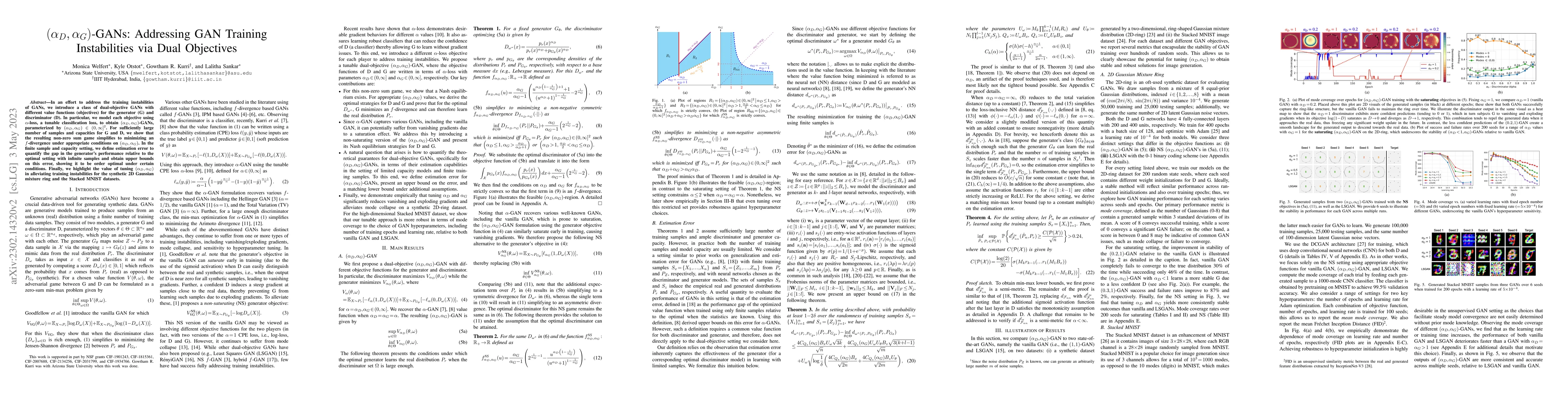 $(\alpha_D,\alpha_G)$-GANs introduce dual objectives with tunable $\alpha$-losses for generator and discriminator to stabilize GAN training, showing improved performance on synthetic datasets. The method simplifies to minimizing an $f$-divergence under ideal conditions and provides order-optimal error bounds for finite sample and capacity settings.