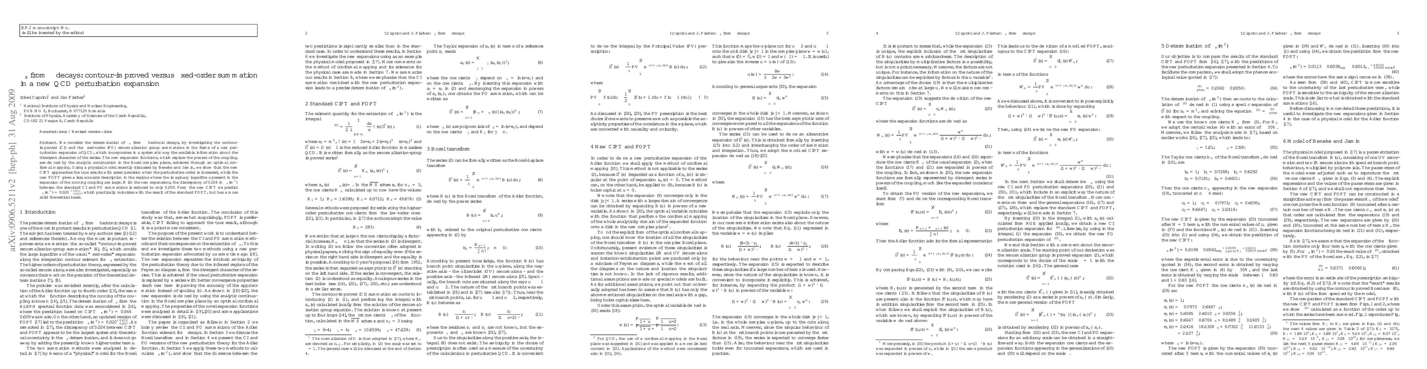 This paper investigates the determination of the strong coupling constant $\alpha_s$ from $\tau$ hadronic decays using two different renormalization group summation methods within a new QCD perturbation expansion. The new contour-improved (CIPT) approach shows greater precision compared to the fixed-order (FOPT) method, reducing the discrepancy in $\alpha_s(m_\tau^2)$ to 0.009 and predicting $\alpha_s(m_\tau^2)= 0.320^{+0.011}_{-0.009}$ with a more robust theoretical foundation.