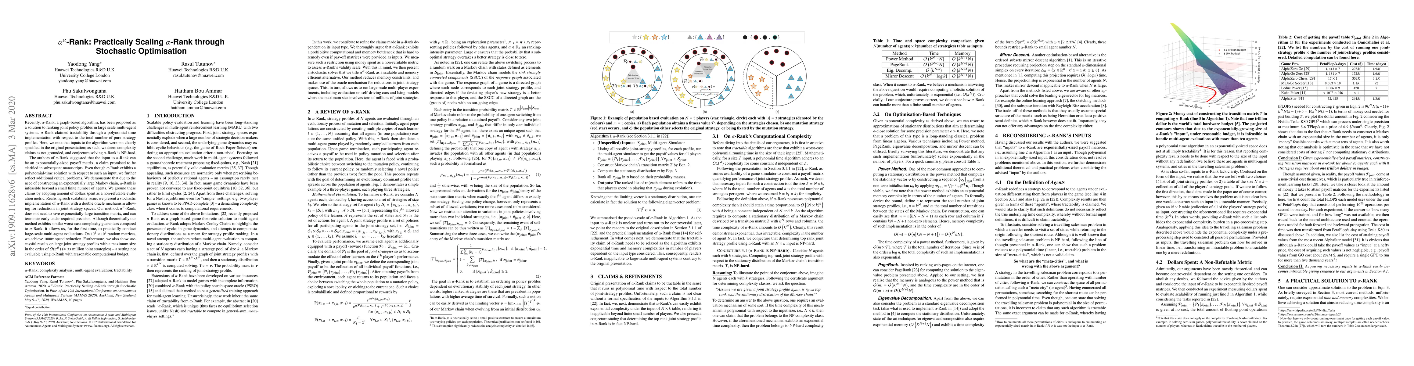 Recently, $\alpha$-Rank, a graph-based algorithm, has been proposed as a solution to ranking joint policy profiles in large scale multi-agent systems. $\alpha$-Rank claimed tractability through a polynomial time implementation with respect to the total number of pure strategy profiles. Here, we note that inputs to the algorithm were not clearly specified in the original presentation; as such, we deem complexity claims as not grounded, and conjecture solving $\alpha$-Rank is NP-hard. The authors of $\alpha$-Rank suggested that the input to $\alpha$-Rank can be an exponentially-sized payoff matrix; a claim promised to be clarified in subsequent manuscripts. Even though $\alpha$-Rank exhibits a polynomial-time solution with respect to such an input, we further reflect additional critical problems. We demonstrate that due to the need of constructing an exponentially large Markov chain, $\alpha$-Rank is infeasible beyond a small finite number of agents. We ground these claims by adopting amount of dollars spent as a non-refutable evaluation metric. Realising such scalability issue, we present a stochastic implementation of $\alpha$-Rank with a double oracle mechanism allowing for reductions in joint strategy spaces. Our method, $\alpha^\alpha$-Rank, does not need to save exponentially-large transition matrix, and can terminate early under required precision. Although theoretically our method exhibits similar worst-case complexity guarantees compared to $\alpha$-Rank, it allows us, for the first time, to practically conduct large-scale multi-agent evaluations. On $10^4 \times 10^4$ random matrices, we achieve $1000x$ speed reduction. Furthermore, we also show successful results on large joint strategy profiles with a maximum size in the order of $\mathcal{O}(2^{25})$ ($\approx 33$ million joint strategies) -- a setting not evaluable using $\alpha$-Rank with reasonable computational budget.