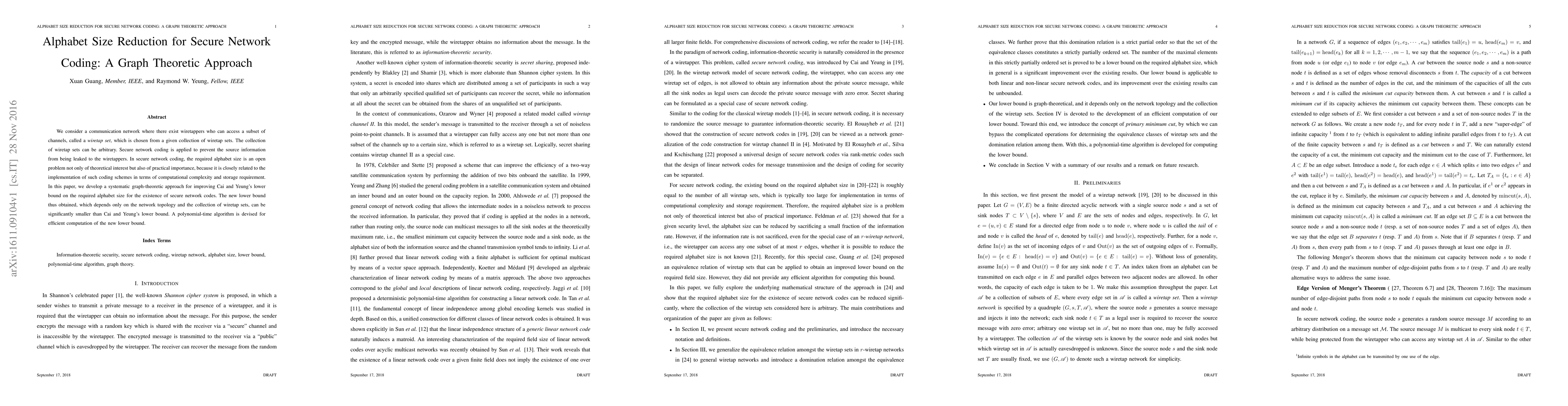 This paper proposes a graph-theoretic approach to reduce the required alphabet size for secure network coding, improving upon existing lower bounds and enabling more efficient implementation in terms of complexity and storage. A polynomial-time algorithm is developed to compute the new, potentially smaller lower bound based on network topology and wiretap sets.