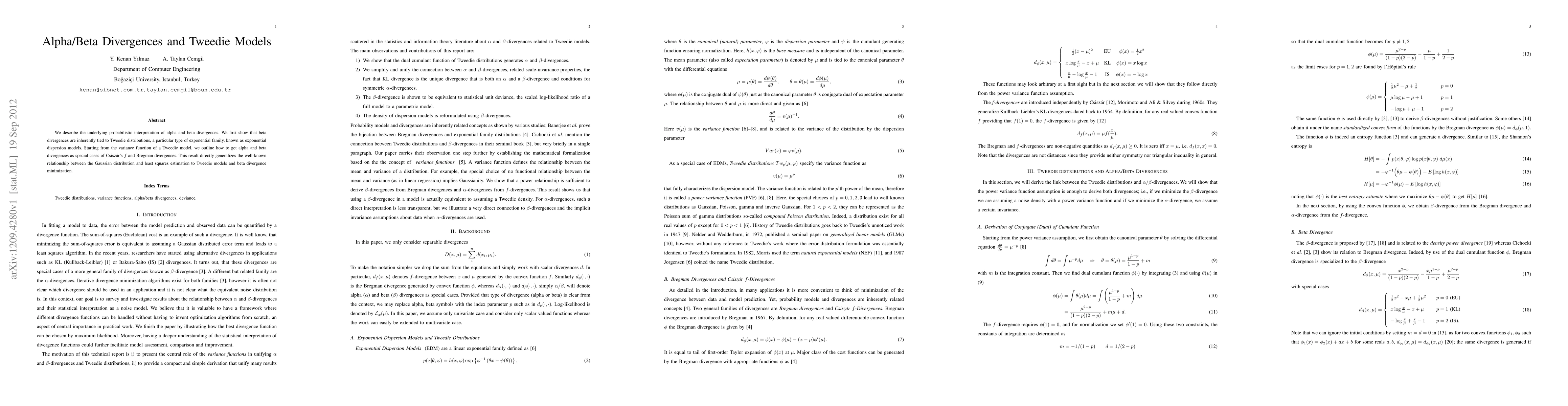 This paper explores the probabilistic link between alpha and beta divergences and Tweedie distributions, demonstrating that beta divergences are intrinsically connected to Tweedie models. It generalizes the relationship between the Gaussian distribution and least squares estimation to Tweedie models using beta divergence minimization.