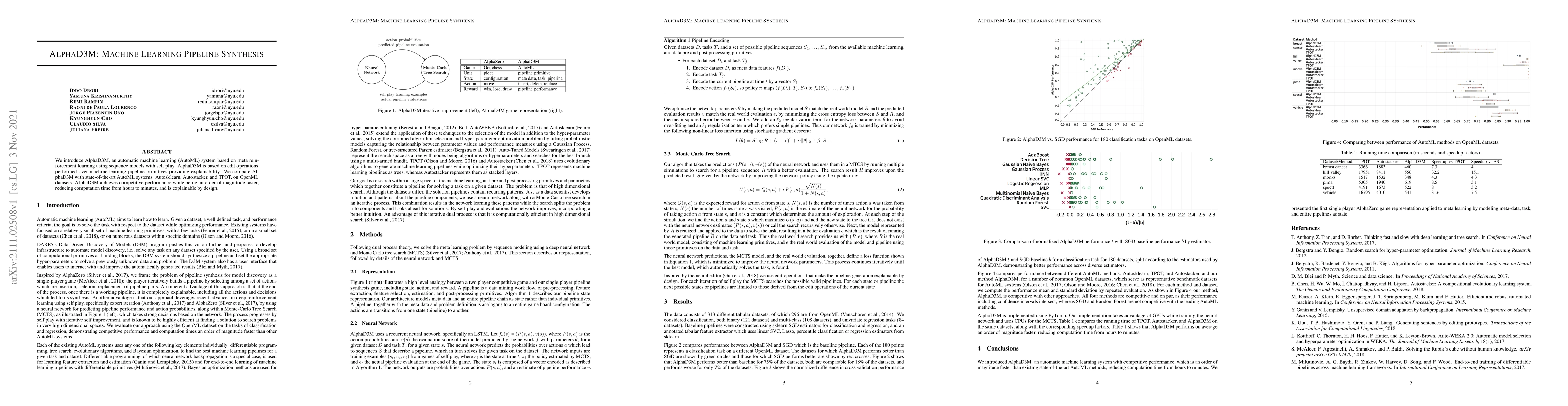 AlphaD3M is an AutoML system utilizing meta reinforcement learning and sequence models for automatic machine learning pipeline synthesis. It outperforms other AutoML systems like Autosklearn, Autostacker, and TPOT by achieving competitive performance while significantly reducing computation time and offering inherent explainability.