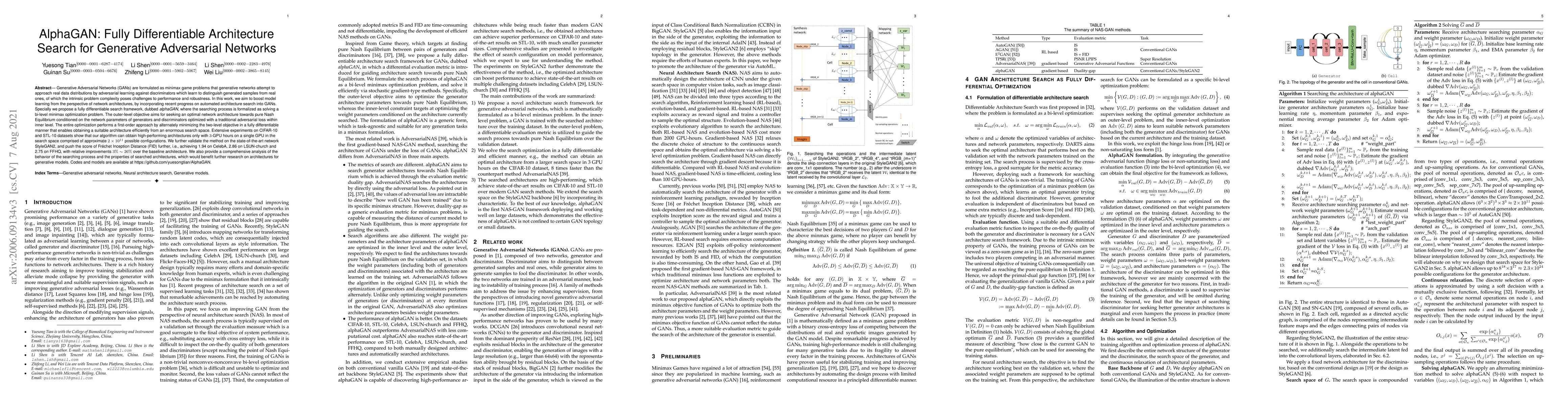 AlphaGAN proposes a fully differentiable architecture search framework for Generative Adversarial Networks (GANs) to optimize network architectures for achieving Nash Equilibrium. The method efficiently searches through an enormous configuration space, achieving high performance with minimal computational resources.