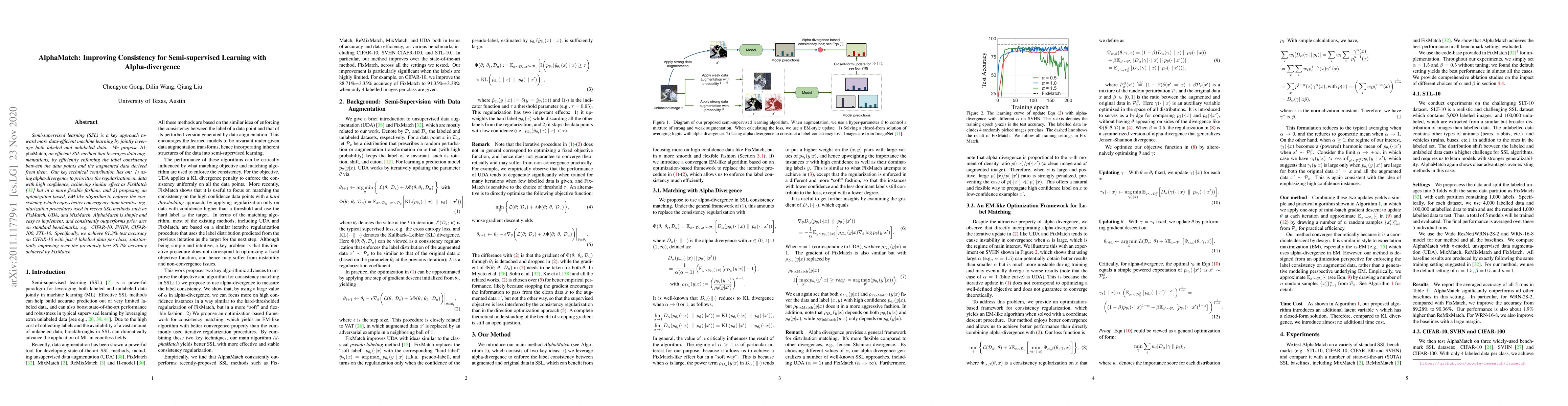 Semi-supervised learning (SSL) is a key approach toward more data-efficient machine learning by jointly leverage both labeled and unlabeled data. We propose AlphaMatch, an efficient SSL method that leverages data augmentations, by efficiently enforcing the label consistency between the data points and the augmented data derived from them. Our key technical contribution lies on: 1) using alpha-divergence to prioritize the regularization on data with high confidence, achieving a similar effect as FixMatch but in a more flexible fashion, and 2) proposing an optimization-based, EM-like algorithm to enforce the consistency, which enjoys better convergence than iterative regularization procedures used in recent SSL methods such as FixMatch, UDA, and MixMatch. AlphaMatch is simple and easy to implement, and consistently outperforms prior arts on standard benchmarks, e.g. CIFAR-10, SVHN, CIFAR-100, STL-10. Specifically, we achieve 91.3% test accuracy on CIFAR-10 with just 4 labelled data per class, substantially improving over the previously best 88.7% accuracy achieved by FixMatch.