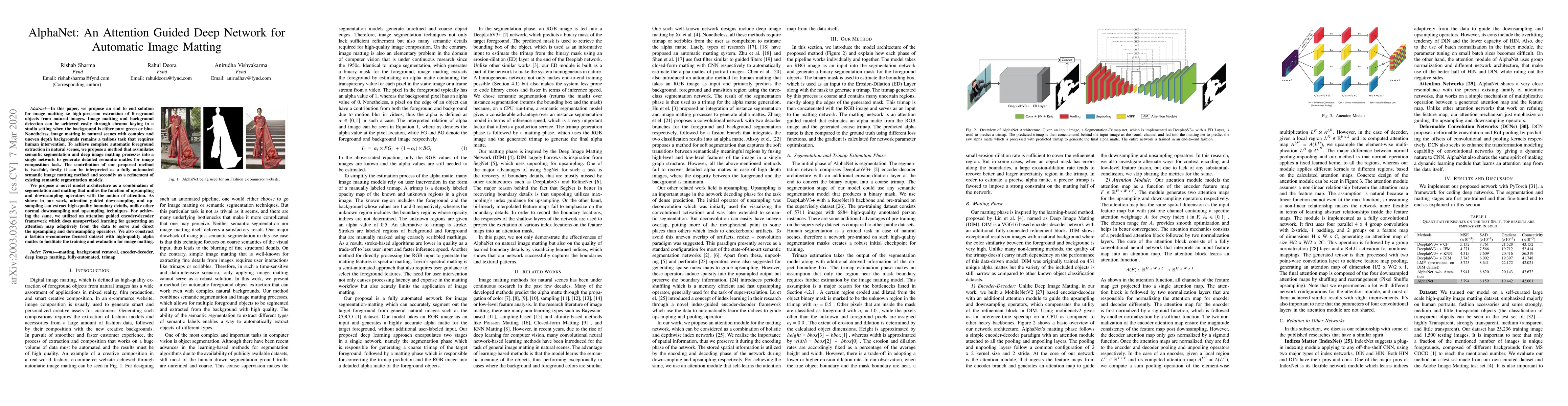 The paper proposes AlphaNet, an attention-guided deep network for automatic image matting, integrating semantic segmentation and matting into a unified framework to achieve high-precision foreground extraction in natural scenes. The method employs an attention-guided encoder-decoder architecture for unsupervised learning to generate adaptive attention maps, enhancing boundary detail extraction.