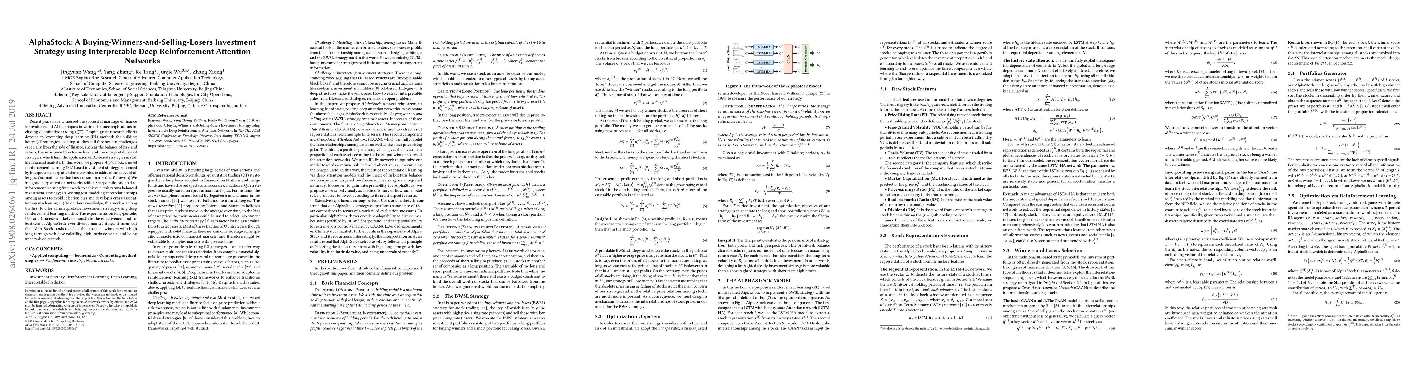 AlphaStock proposes a reinforcement learning-based investment strategy enhanced by interpretable deep attention networks to address risk-return balance, extreme loss resistance, and interpretability challenges in quantitative trading. The strategy demonstrates effectiveness and robustness in U.S. and Chinese markets, selecting stocks with high long-term growth and low volatility.