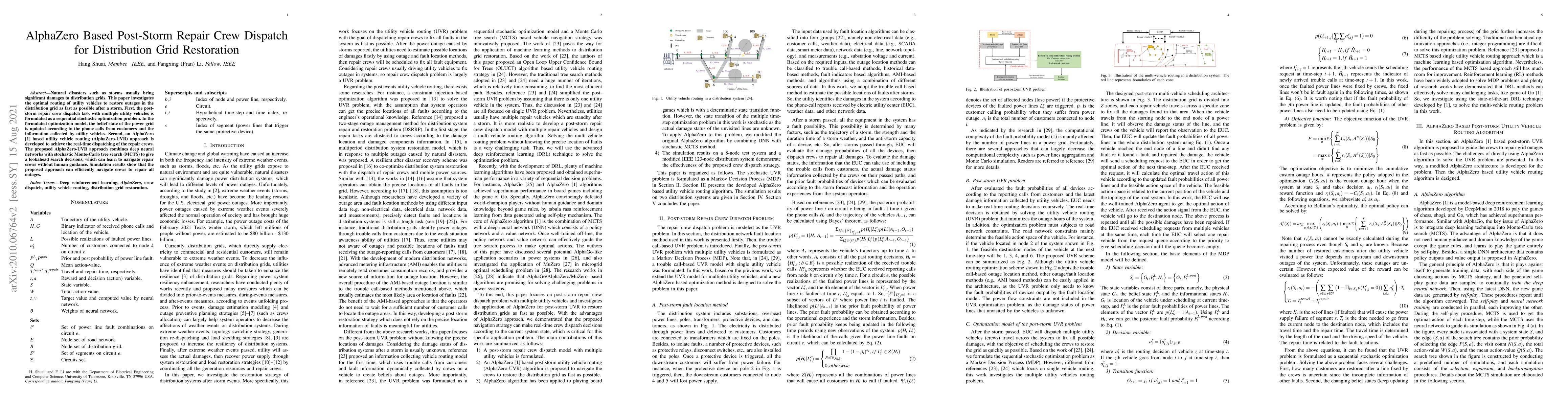 Natural disasters such as storms usually bring significant damages to distribution grids. This paper investigates the optimal routing of utility vehicles to restore outages in the distribution grid as fast as possible after a storm. First, the poststorm repair crew dispatch task with multiple utility vehicles is formulated as a sequential stochastic optimization problem. In the formulated optimization model, the belief state of the power grid is updated according to the phone calls from customers and the information collected by utility vehicles. Second, an AlphaZero[1] based utility vehicle routing (AlphaZero-UVR) approach is developed to achieve the real-time dispatching of the repair crews. The proposed AlphaZero-UVR approach combines deep neural networks with stochastic Monte-Carlo tree search (MCTS) to give a lookahead search decisions, which can learn to navigate repair crews without human guidance. Simulation results show that the proposed approach can efficiently navigate crews to repair all outages.