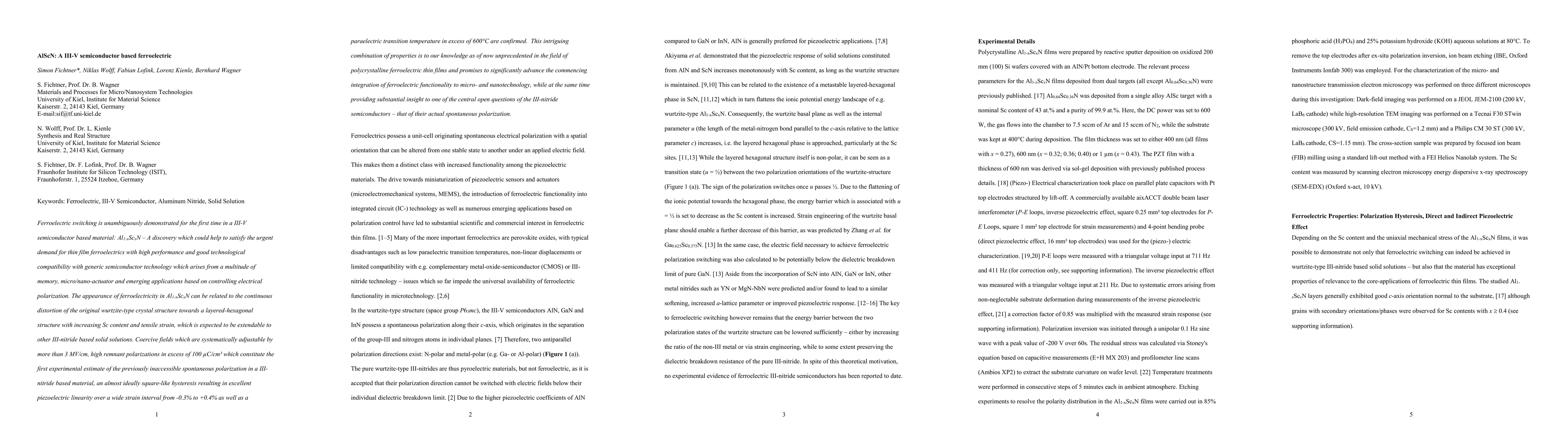 This paper demonstrates ferroelectric switching in AlScN, a III-V semiconductor, for the first time, showcasing high performance and compatibility with semiconductor technology. The material exhibits adjustable coercive fields, high remnant polarization, and excellent piezoelectric linearity, promising advancements in micro- and nanotechnology integration.