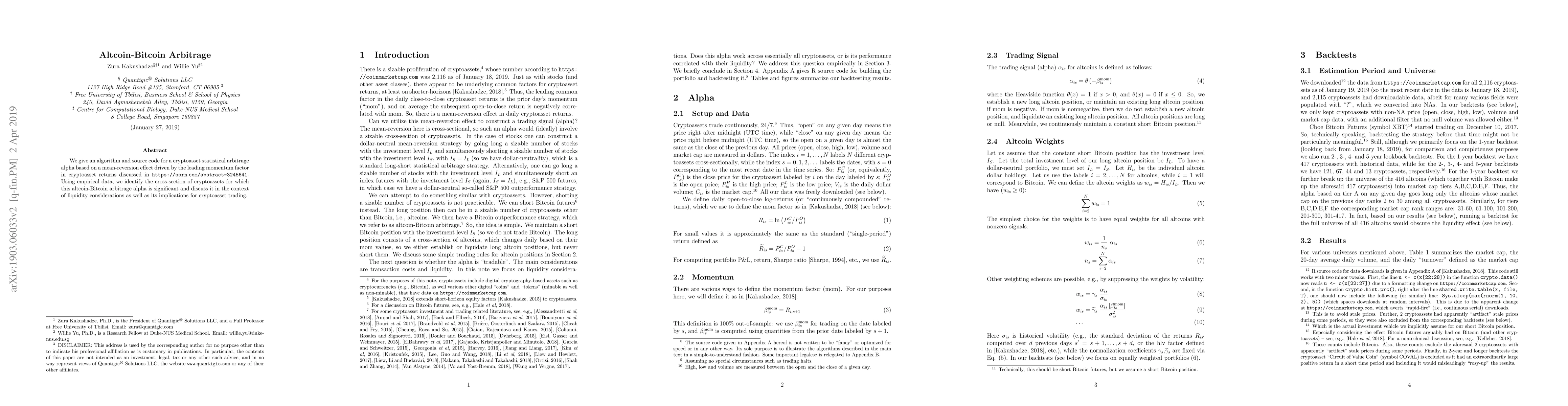We give an algorithm and source code for a cryptoasset statistical arbitrage alpha based on a mean-reversion effect driven by the leading momentum factor in cryptoasset returns discussed in https://ssrn.com/abstract=3245641. Using empirical data, we identify the cross-section of cryptoassets for which this altcoin-Bitcoin arbitrage alpha is significant and discuss it in the context of liquidity considerations as well as its implications for cryptoasset trading.