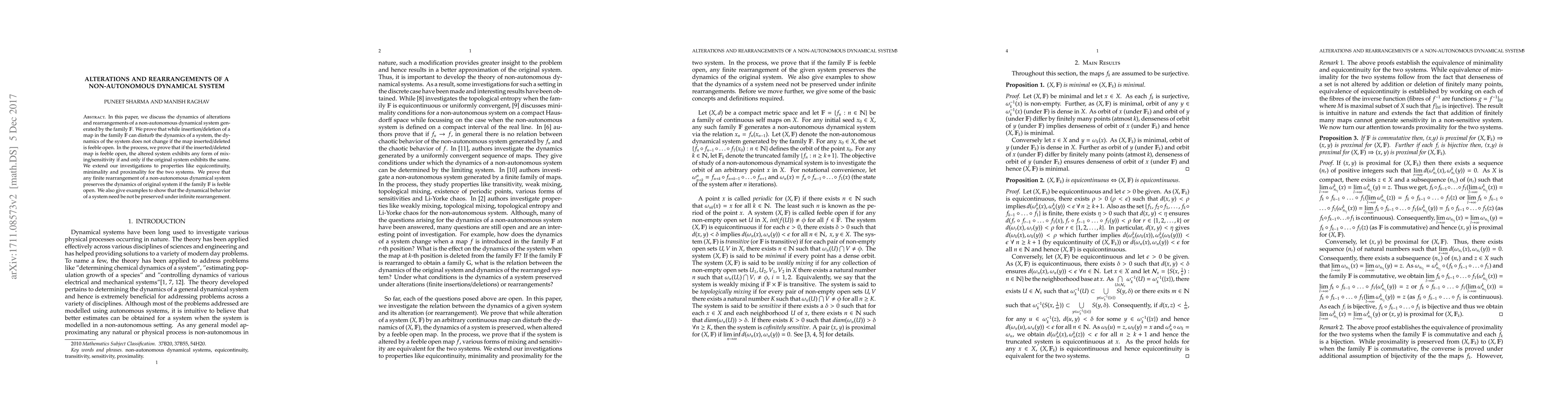 In this paper, we discuss the dynamics of alterations and rearrangements of a non-autonomous dynamical system generated by the family $\mathbb{F}$. We prove that while insertion/deletion of a map in the family $\mathbb{F}$ can disturb the dynamics of a system, the dynamics of the system does not change if the map inserted/deleted is feeble open. In the process, we prove that if the inserted/deleted map is feeble open, the altered system exhibits any form of mixing/sensitivity if and only if the original system exhibits the same. We extend our investigations to properties like equicontinuity, minimality and proximality for the two systems. We prove that any finite rearrangement of a non-autonomous dynamical system preserves the dynamics of original system if the family $\mathbb{F}$ is feeble open. We also give examples to show that the dynamical behavior of a system need be not be preserved under infinite rearrangement.