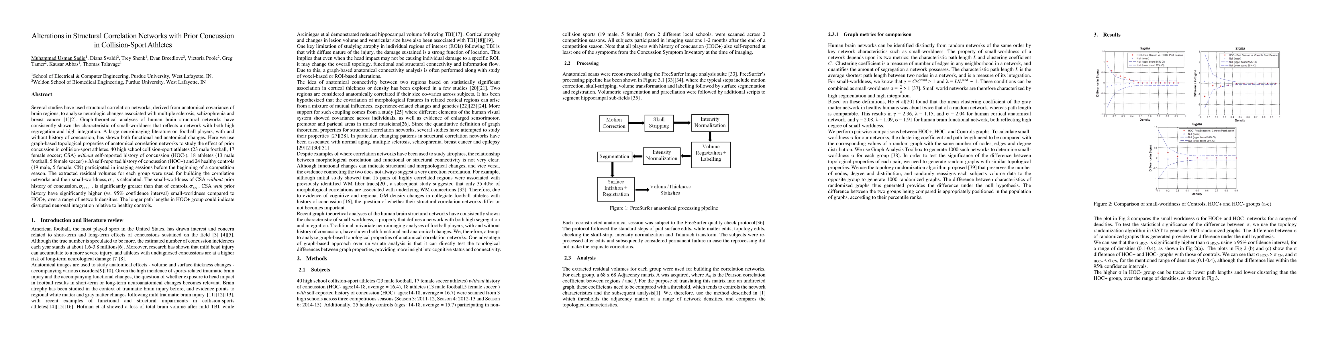 Several studies have used structural correlation networks, derived from anatomical covariance of brain regions, to analyze neurologic changes associated with multiple sclerosis, schizophrenia and breast cancer [1][2]. Graph-theoretical analyses of human brain structural networks have consistently shown the characteristic of small-worldness that reflects a network with both high segregation and high integration. A large neuroimaging literature on football players, with and without history of concussion, has shown both functional and anatomical changes. Here we use graph-based topological properties of anatomical correlation networks to study the effect of prior concussion in collision-sport athletes. 40 high school collision-sport athletes (23 male football, 17 female soccer; CSA) without self-reported history of concussion (HOC-), 18 athletes (13 male football, 5 female soccer) with self-reported history of concussion (HOC+) and 24 healthy controls (19 male, 5 female; CN) participated in imaging sessions before the beginning of a competition season. The extracted residual volumes for each group were used for building the correlation networks and their small-worldness, , is calculated. The small-worldness of CSA without prior history of concussion, , is significantly greater than that of controls, . CSA with prior history have significantly higher (vs. 95% confidence interval) small-worldness compared to HOC+, over a range of network densities. The longer path lengths in HOC+ group could indicate disrupted neuronal integration relative to healthy controls.