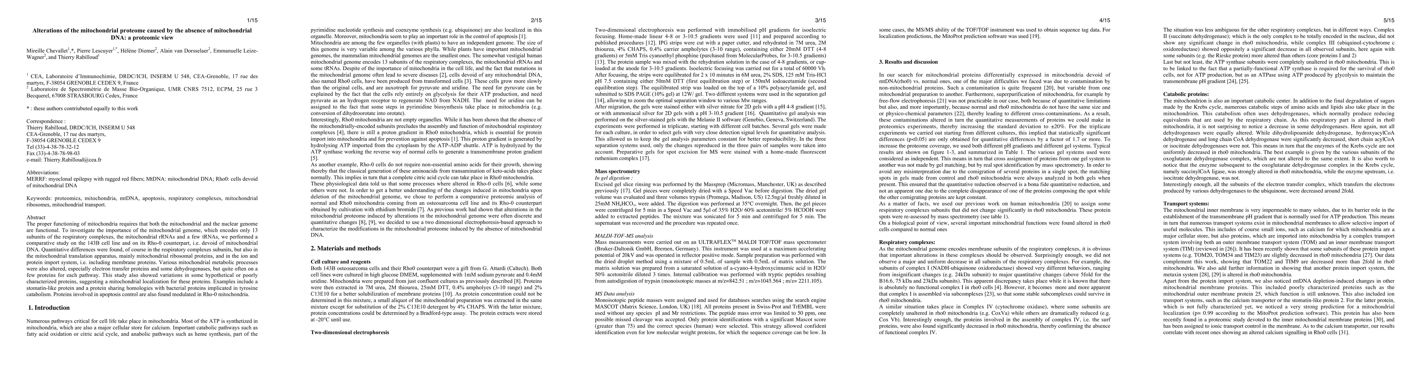 The proper functioning of mitochondria requires that both the mitochondrial and the nuclear genome are functional. To investigate the importance of the mitochondrial genome, which encodes only 13 subunits of the respiratory complexes, the mitochondrial rRNAs and a few tRNAs, we performed a comparative study on the 143B cell line and on its Rho-0 counterpart, i.e., devoid of mitochondrial DNA. Quantitative differences were found, of course in the respiratory complexes subunits, but also in the mitochondrial translation apparatus, mainly mitochondrial ribosomal proteins, and in the ion and protein import system, i.e., including membrane proteins. Various mitochondrial metabolic processes were also altered, especially electron transfer proteins and some dehydrogenases, but quite often on a few proteins for each pathway. This study also showed variations in some hypothetical or poorly characterized proteins, suggesting a mitochondrial localization for these proteins. Examples include a stomatin-like protein and a protein sharing homologies with bacterial proteins implicated in tyrosine catabolism. Proteins involved in apoptosis control are also found modulated in Rho-0 mitochondria.