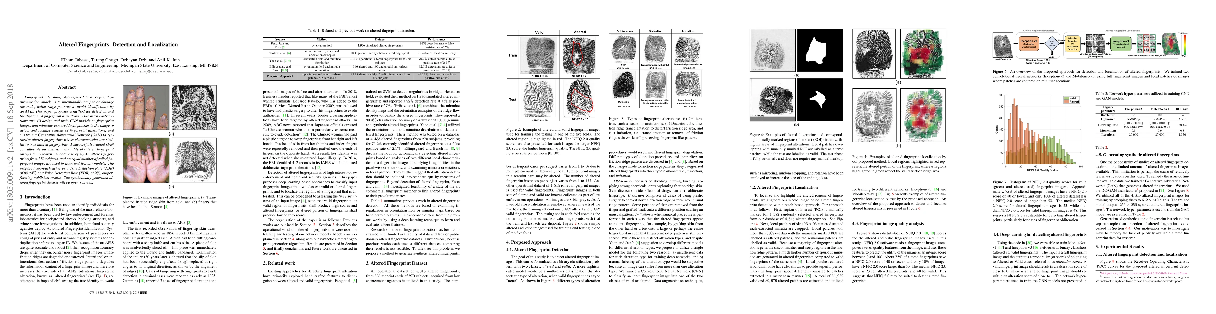 Fingerprint alteration, also referred to as obfuscation presentation attack, is to intentionally tamper or damage the real friction ridge patterns to avoid identification by an AFIS. This paper proposes a method for detection and localization of fingerprint alterations. Our main contributions are: (i) design and train CNN models on fingerprint images and minutiae-centered local patches in the image to detect and localize regions of fingerprint alterations, and (ii) train a Generative Adversarial Network (GAN) to synthesize altered fingerprints whose characteristics are similar to true altered fingerprints. A successfully trained GAN can alleviate the limited availability of altered fingerprint images for research. A database of 4,815 altered fingerprints from 270 subjects, and an equal number of rolled fingerprint images are used to train and test our models. The proposed approach achieves a True Detection Rate (TDR) of 99.24% at a False Detection Rate (FDR) of 2%, outperforming published results. The synthetically generated altered fingerprint dataset will be open-sourced.